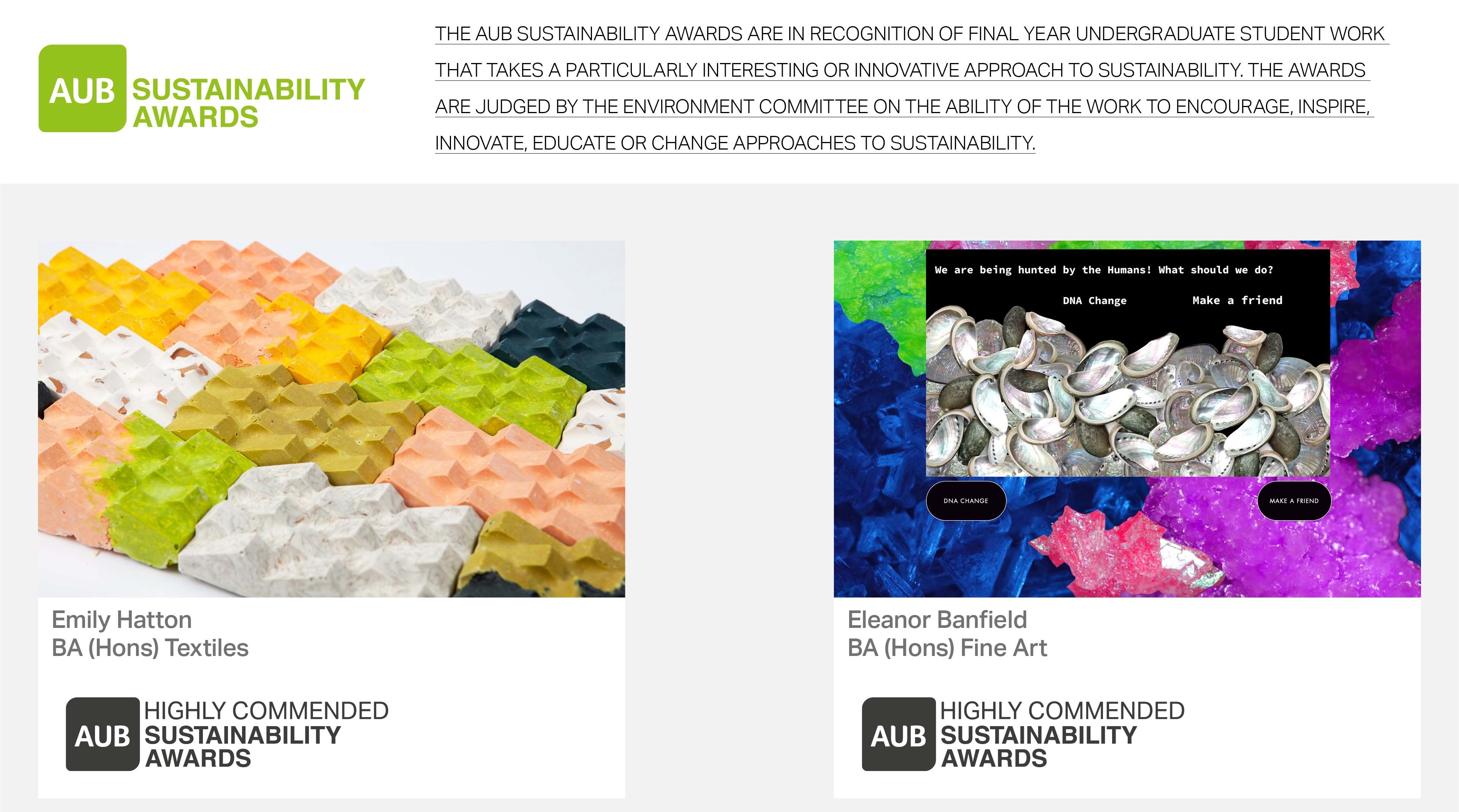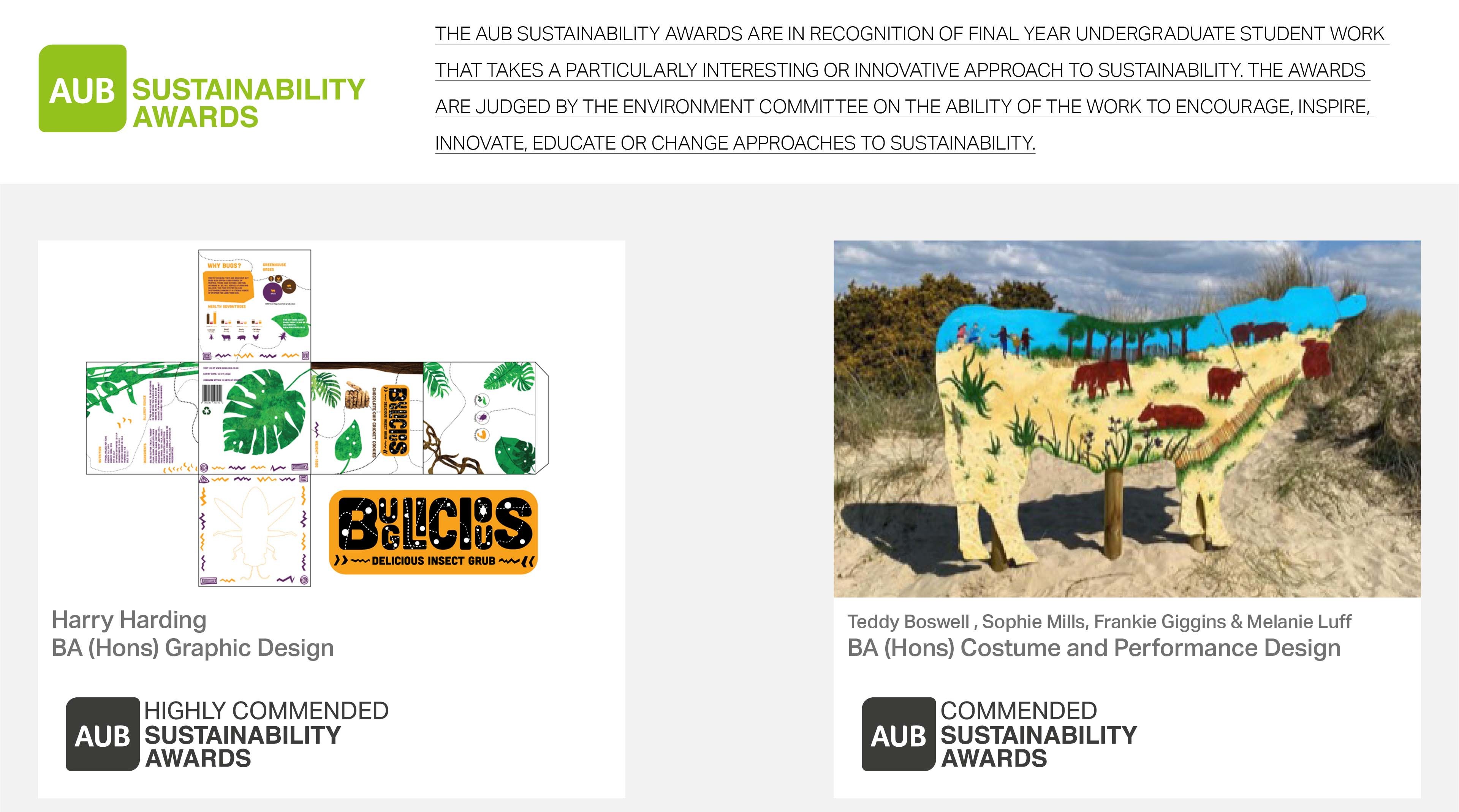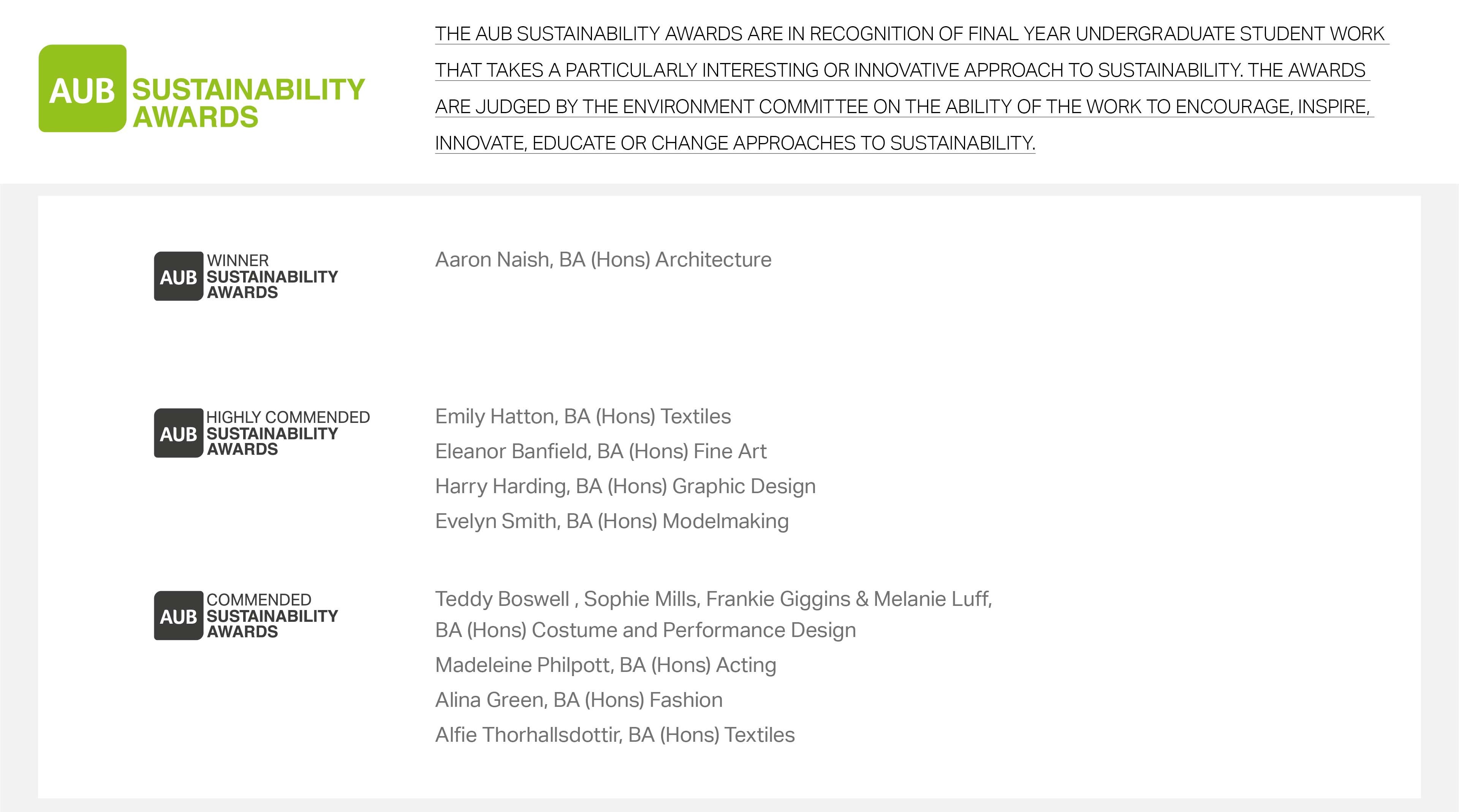 The AUB Sustainability Awards recognise final year students who take a particularly interesting or innovative approach to matters of sustainability through their projects, which rewards the individual students and also creates awareness of issues relating to sustainability, environment and ethics and social justice.