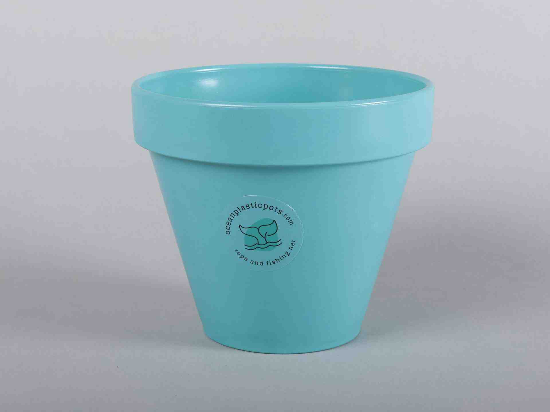 A 13 cm flower pot made of discarded fishing rope. The designer works with an innovative recycler to make plant pots from waste fishing gear, preventing it becoming landfill or pollution. The raw material is selected because of the colour preventing the need to remove or add colour compounds to the mix.