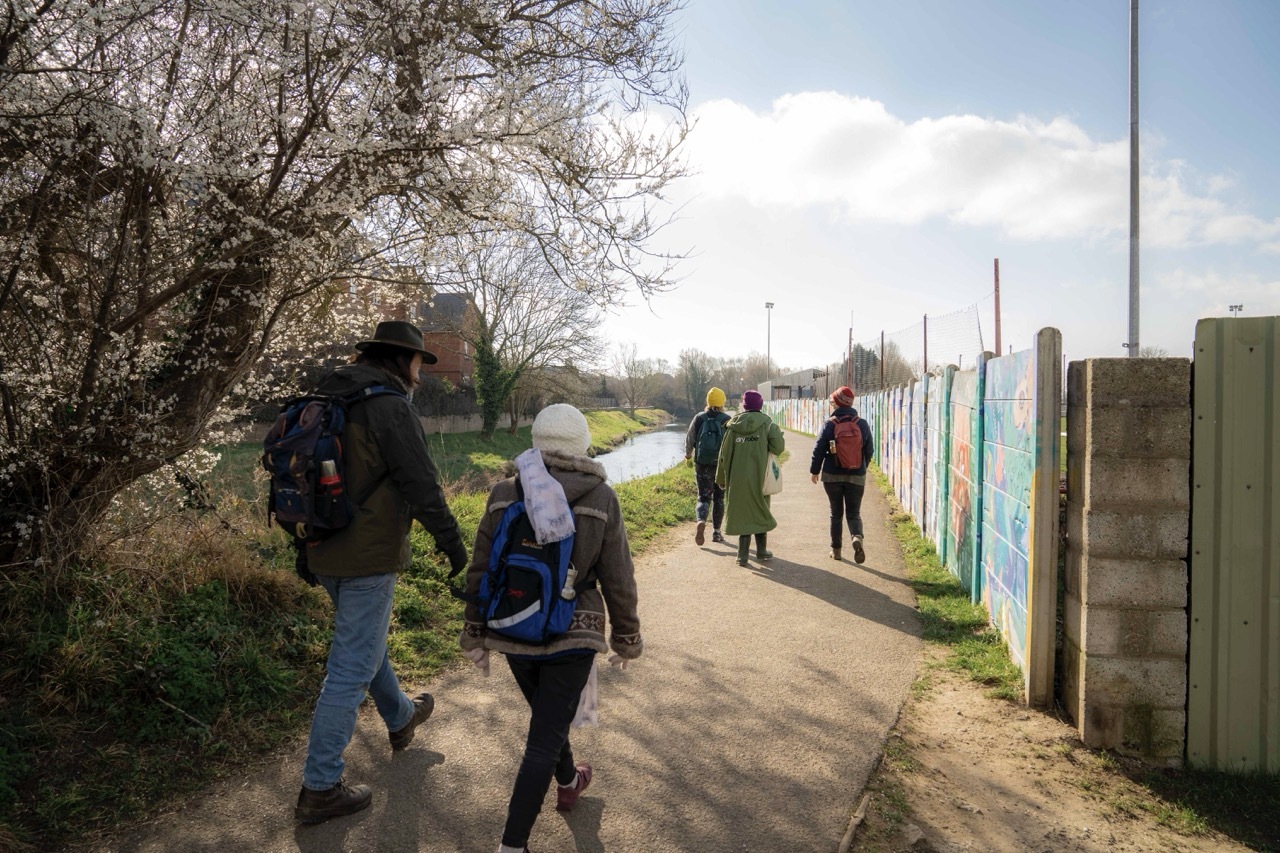 I joined for the first leg of their walk down to West Bay, famously a shooting location for the crime drama Broadchurch. From the picturesque Buckydoo Square, the group’s meeting point, the first 10-15 minutes of the walk took me, as a writer, across a tightrope between the rural and the urban. The community orchard, with its trees still dormant awaiting spring. And then the riverside path, with a water mill on one side, and one of the country’s longest murals on the other.
