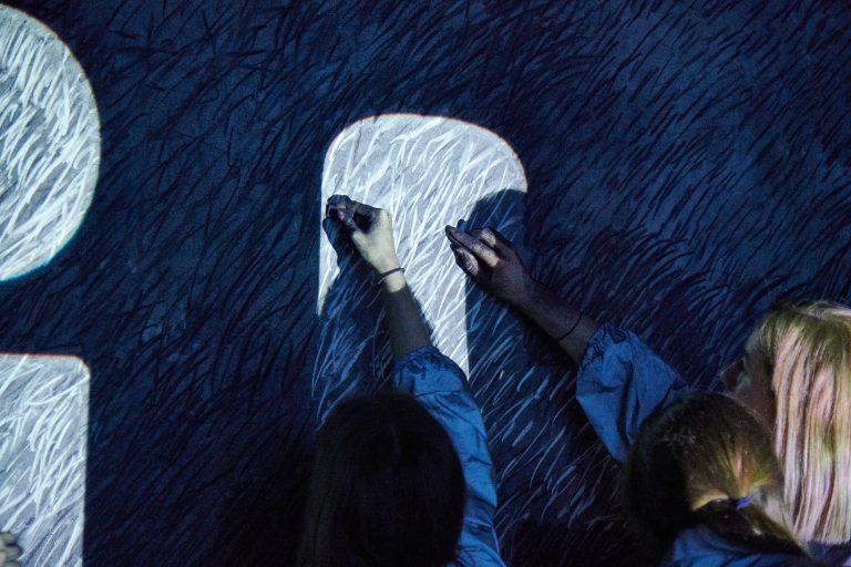 To complete the visual, a large projection of the ITV ident is beamed onto a 5 m x 3 m vertical drawing surface, with the students moving into this light in reflective boiler suits to draw with charcoal. The ident is then seen reflecting and refracting across moving bodies as students climb stepladders to add to the piece.