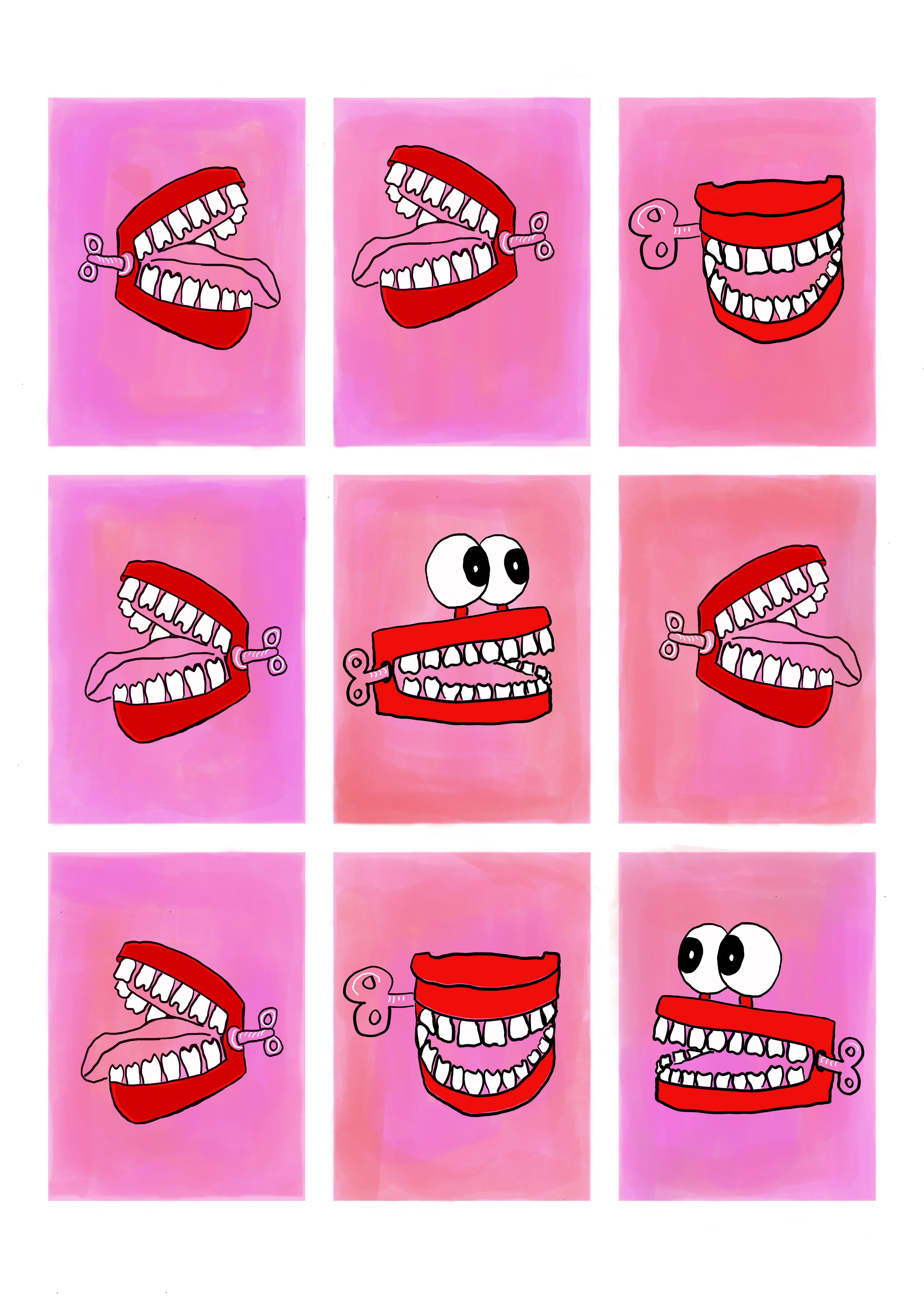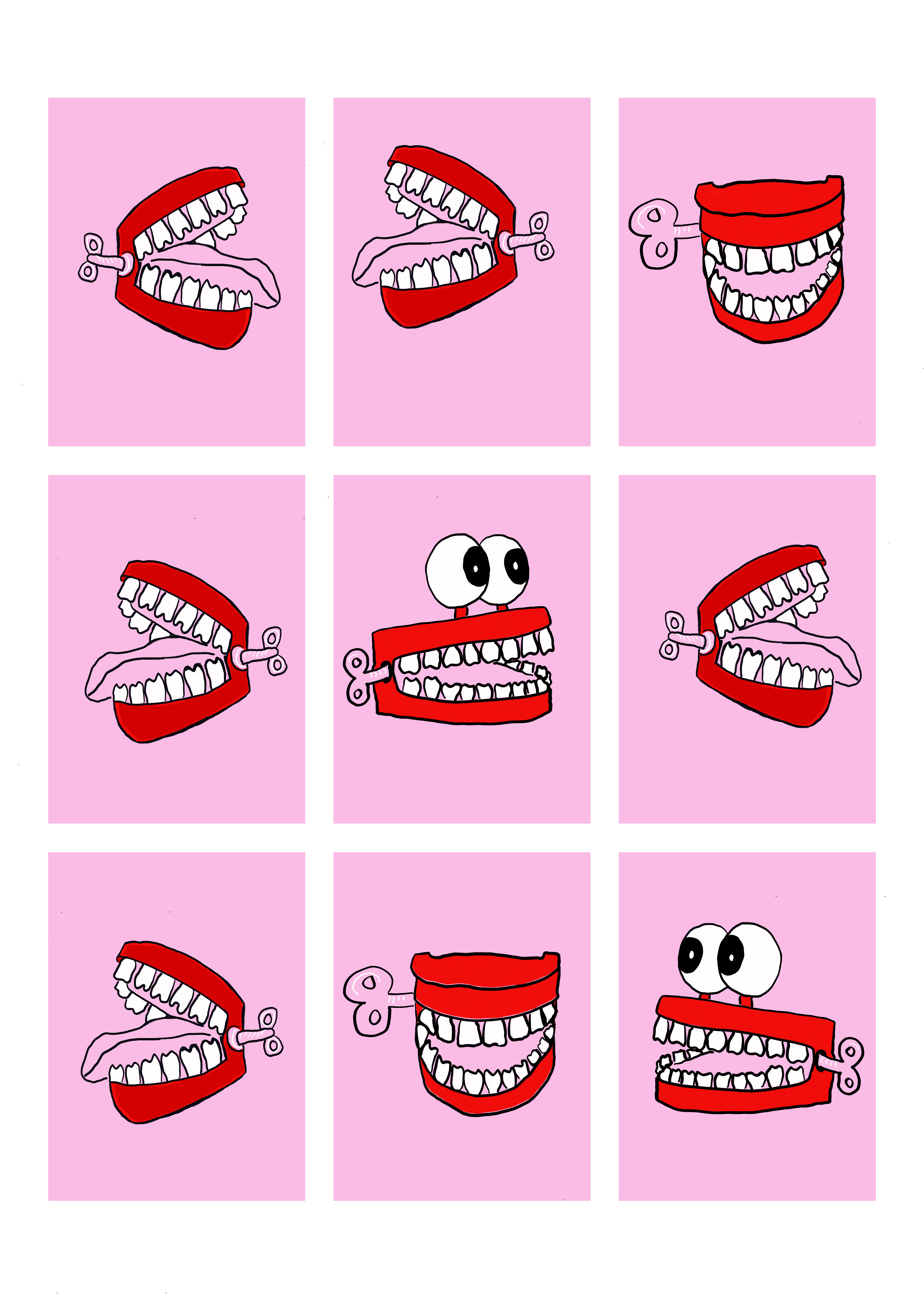 Emma’s exhibited piece, titled Hello, consisted of a series of screen-printed and hand-finished images. The work utilised the universal gesture of greeting to explore the mechanics of human connection. By featuring repeated imagery of wind-up mechanical teeth, the piece investigated the first point of contact between individuals.