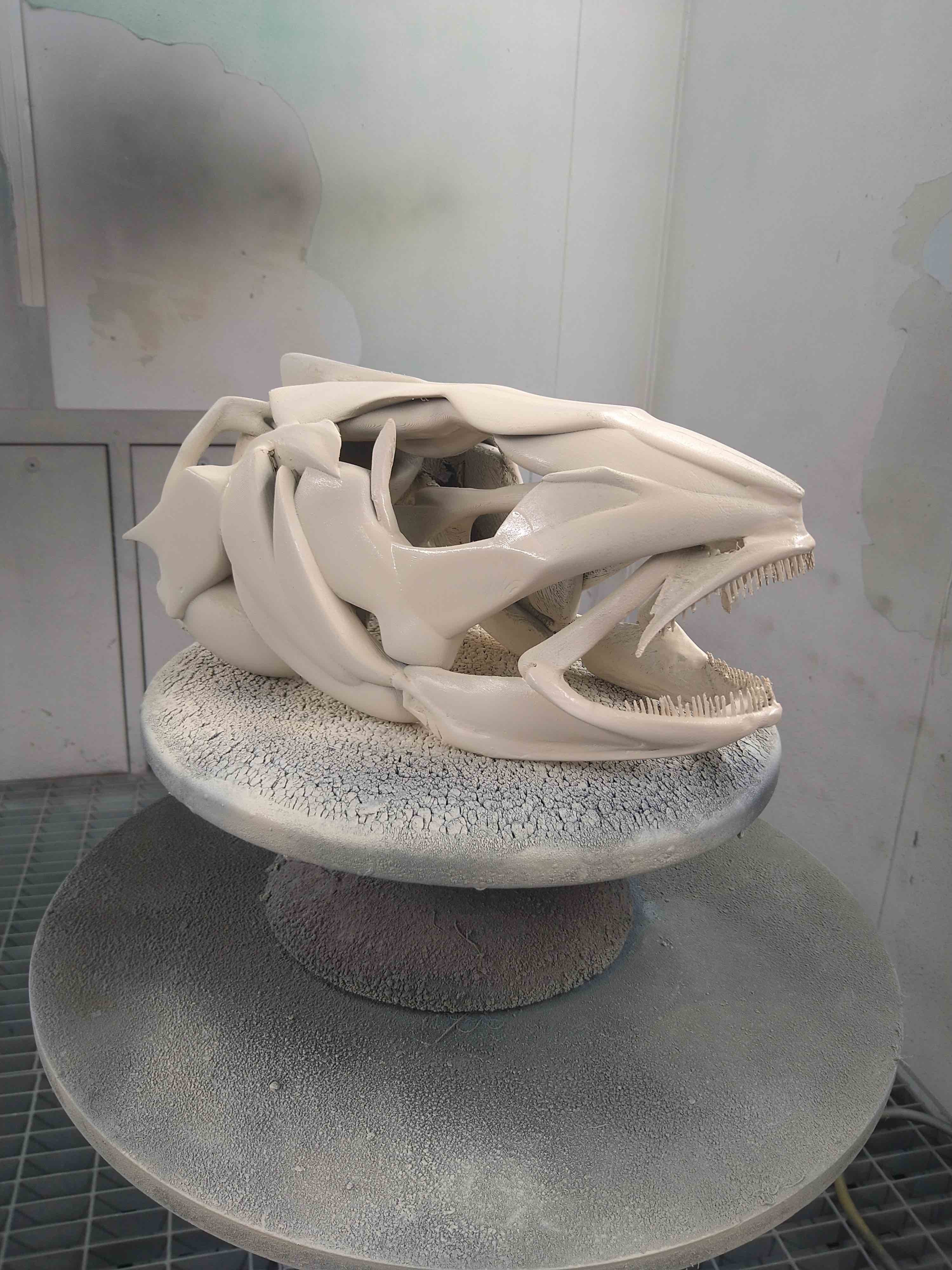 "We laser cut a flat acrylic piece in the outline of the vertebrae and mounted it to a strong steel rod. James got to work on digitally modelling the skull, whilst I began painstakingly moulding each individual vertebra by hand onto the frame we'd created, using epoxy putty.”