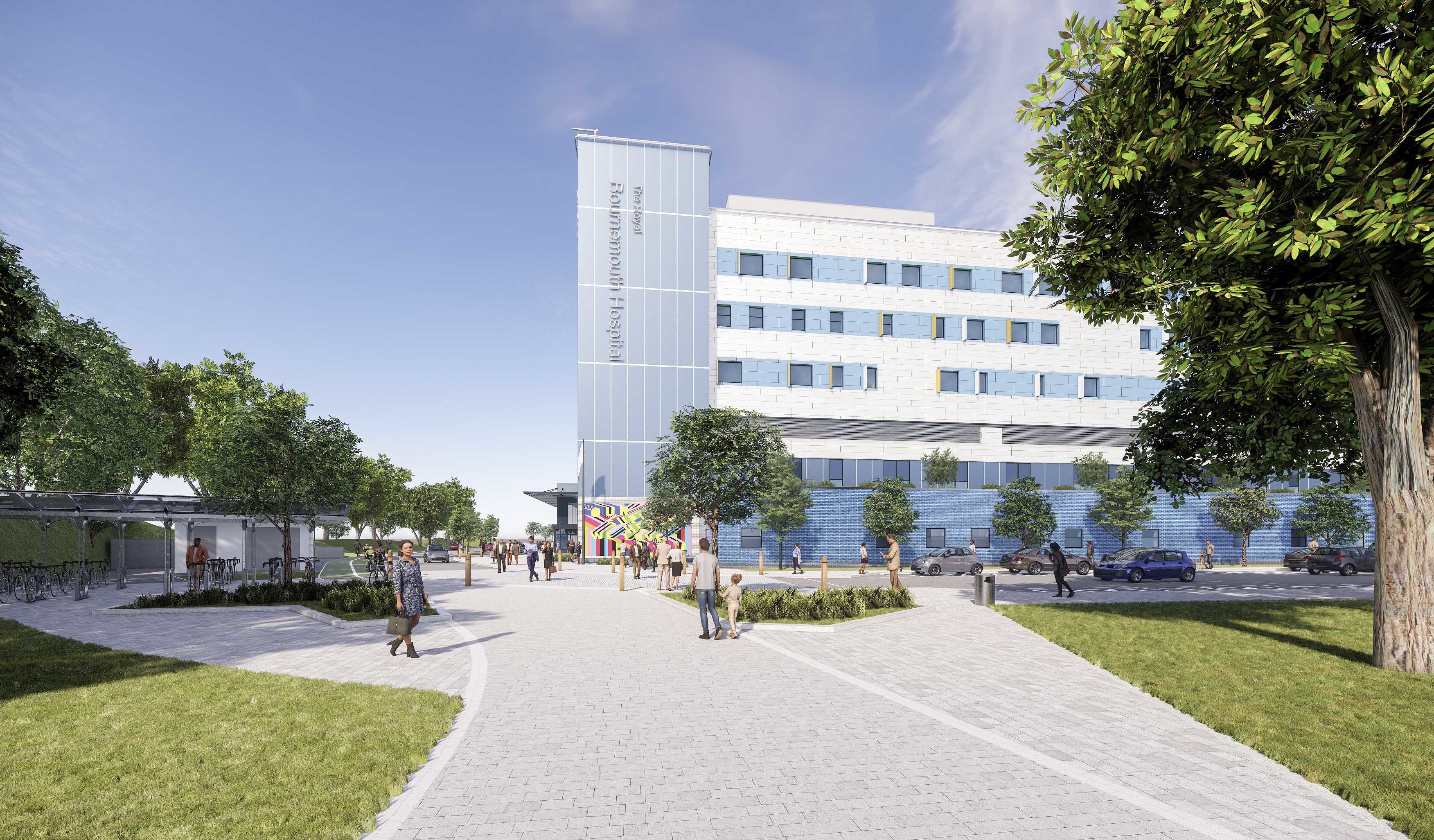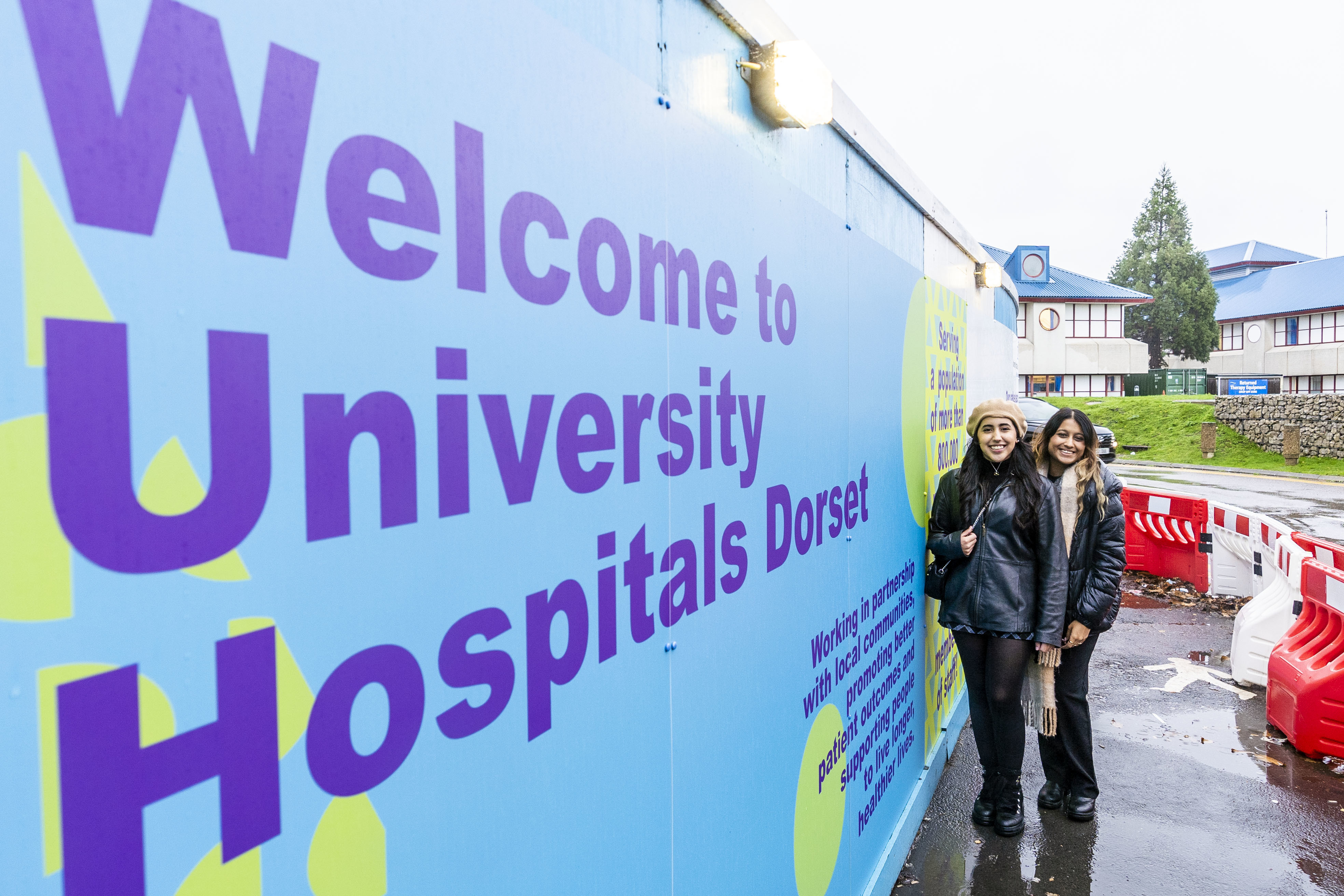 AUB students Julia Binnon, Raquel Di Cori and Dahnya Sandhu are the team behind 130m eye-catching new information panels surrounding the BEACH building. Completing in late 2024, the new building will offer Dorset residents a brand-new maternity unit, children’s unit, enhanced emergency department and 30-bed critical care unit.