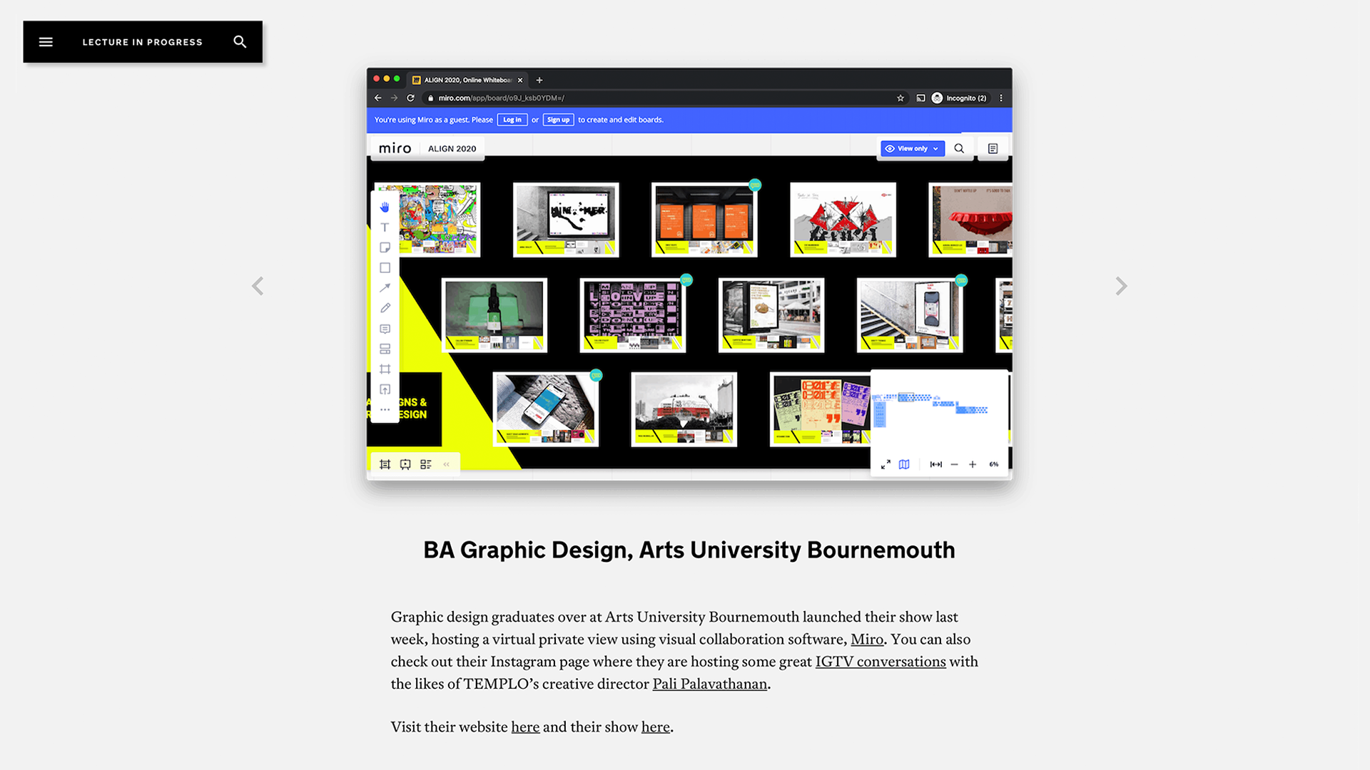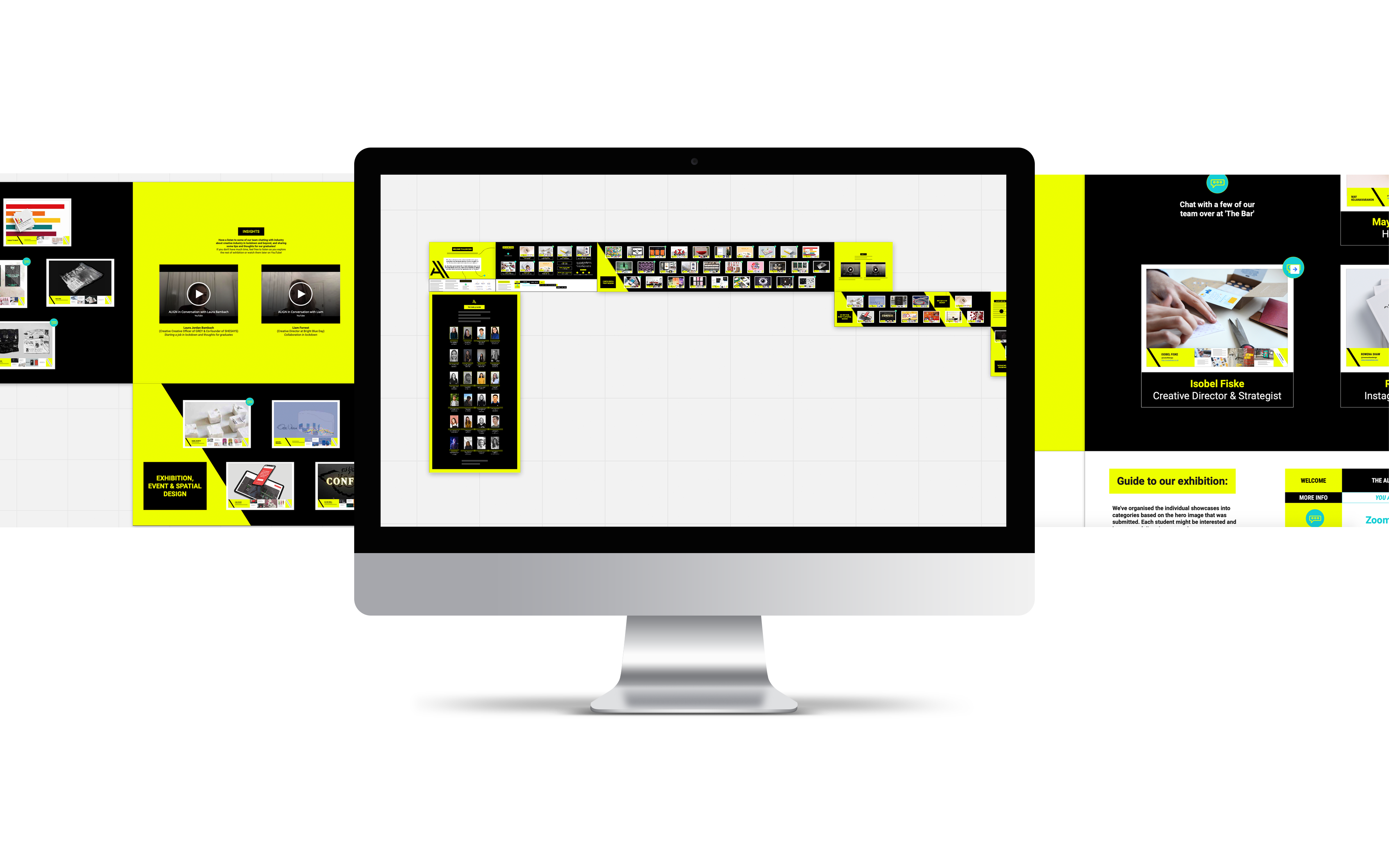 Final year BA (Hons) Graphic Design students push the boundaries of Miro, an online collaborative whiteboard to create a hybridised online private view that provided an online conduit between students and industry.