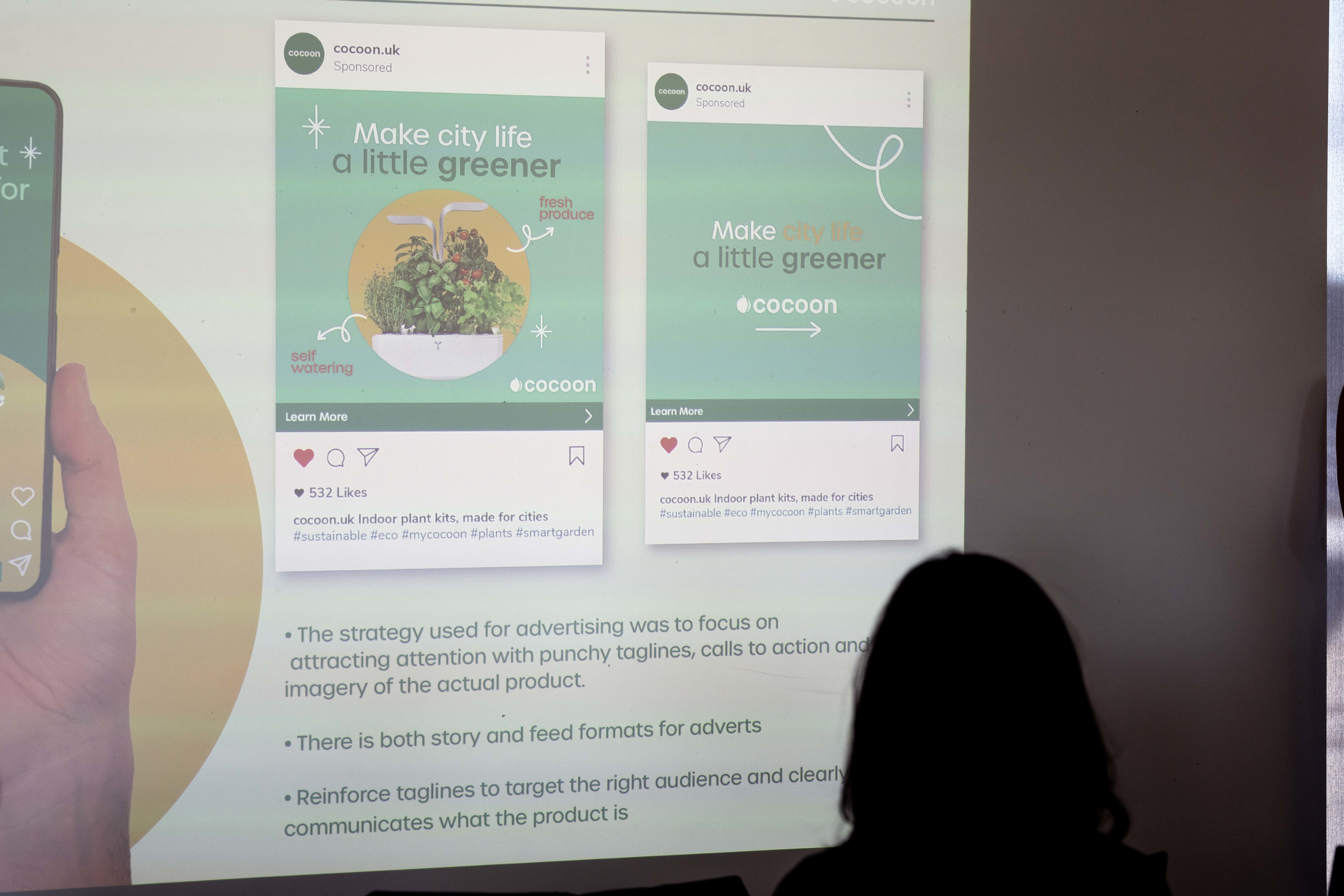 BA (Hons) Visual Communication students focused their marketing on Londoners with busy lifestyles, often living in small spaces. Groups considered communications strategy, including barriers to potential, measurable sustainable goals, and competitors. The teams were also tasked with creating initial launch communications, including social media posts, videos, and advertising.