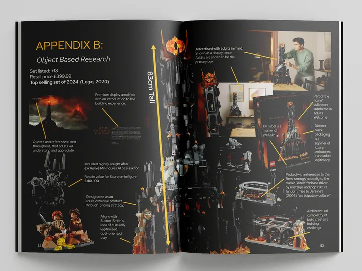 These field observations were backed by close analysis of LEGO’s annual reports, sales trends, and bestseller data, as well as market research from NPD highlighting adult consumers as one of the fastest-growing categories in the toy sector. I also drew on theories of adult play to understand how toys today serve broader emotional, creative, and lifestyle needs.