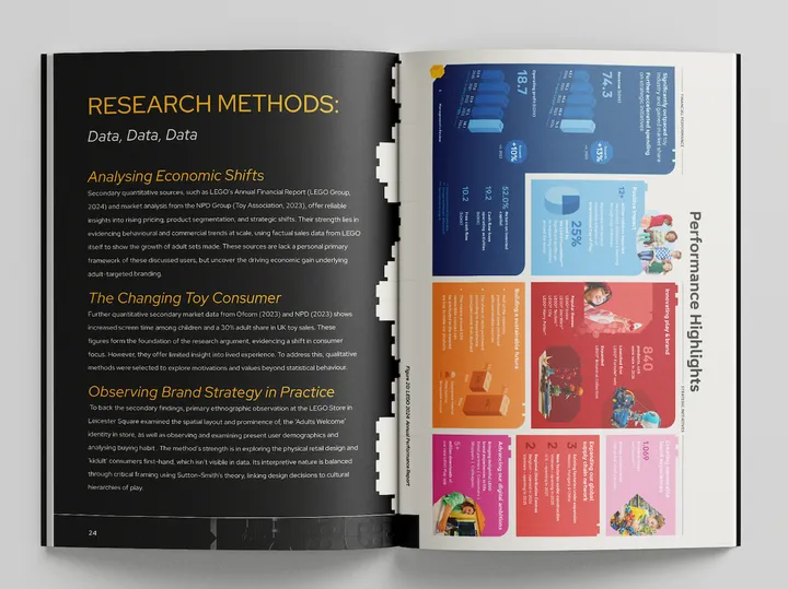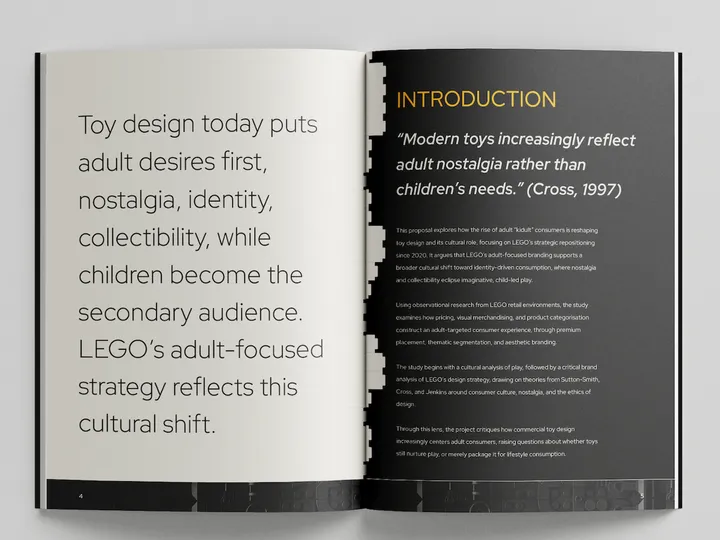 I also made a decision early on to treat this as a design project, not just a written one. That meant making the proposal feel like a brand document. I built it visually from the ground up using colour, layout, and typographic systems inspired by LEGO’s identity. It lives as a fully designed piece of editorial design that sits proudly in my portfolio. Designing it made the process genuinely enjoyable. Instead of producing a static academic submission, I created something I was excited to show others. It didn’t just work as a piece of research, it worked as a piece of design. The design became the hook that made the whole thing click.