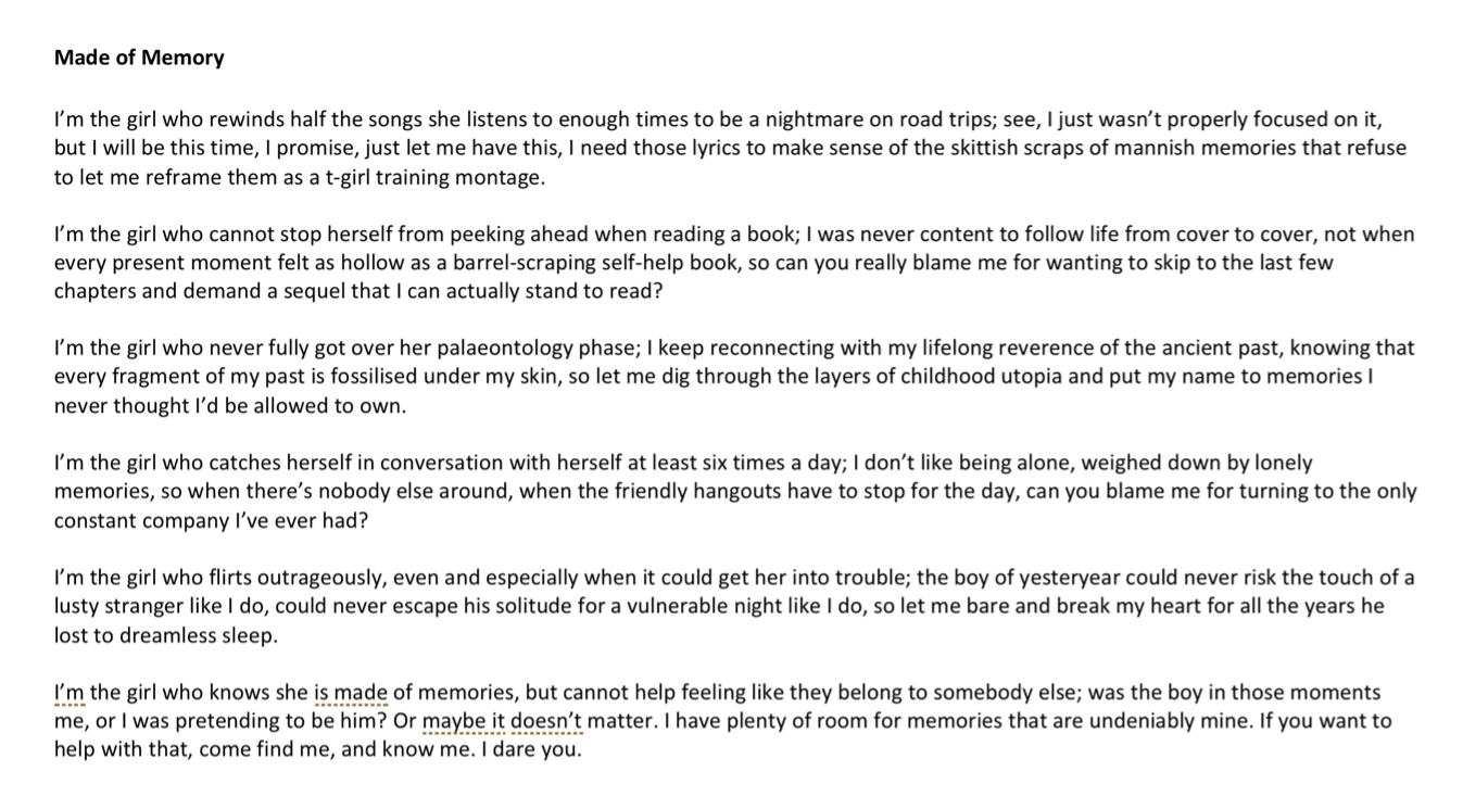 Through this course, I have found immense creative freedom to identify my inspirations and my process. For example, I acknowledged my admiration for Neil Gaiman’s work, especially The Sandman, and his explorations of human nature within a surreal fantasy story. I realised how intensely I wanted to cultivate my own take on that by telling stories and creating poetry that reflected my experiences as a trans woman, and hopefully I could create stories for other trans people that I wish I’d had growing up.