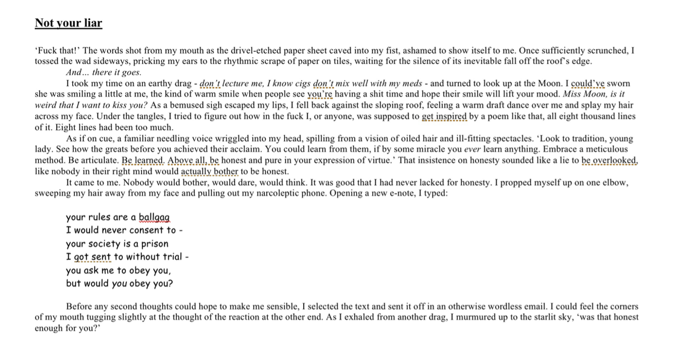 This is not to say that I eschew the processes of editing and utilising peer feedback. These have been essential in working on projects, polishing pieces that may have glaring issues. For example, a poem I write, in its roughest form, may rely solely on the words I write, which works fine for spoken word poetry. But the process of editing might reveal to me ways of arranging the words on a page in ways that enhance my intentions and hook the reader’s attention for longer.