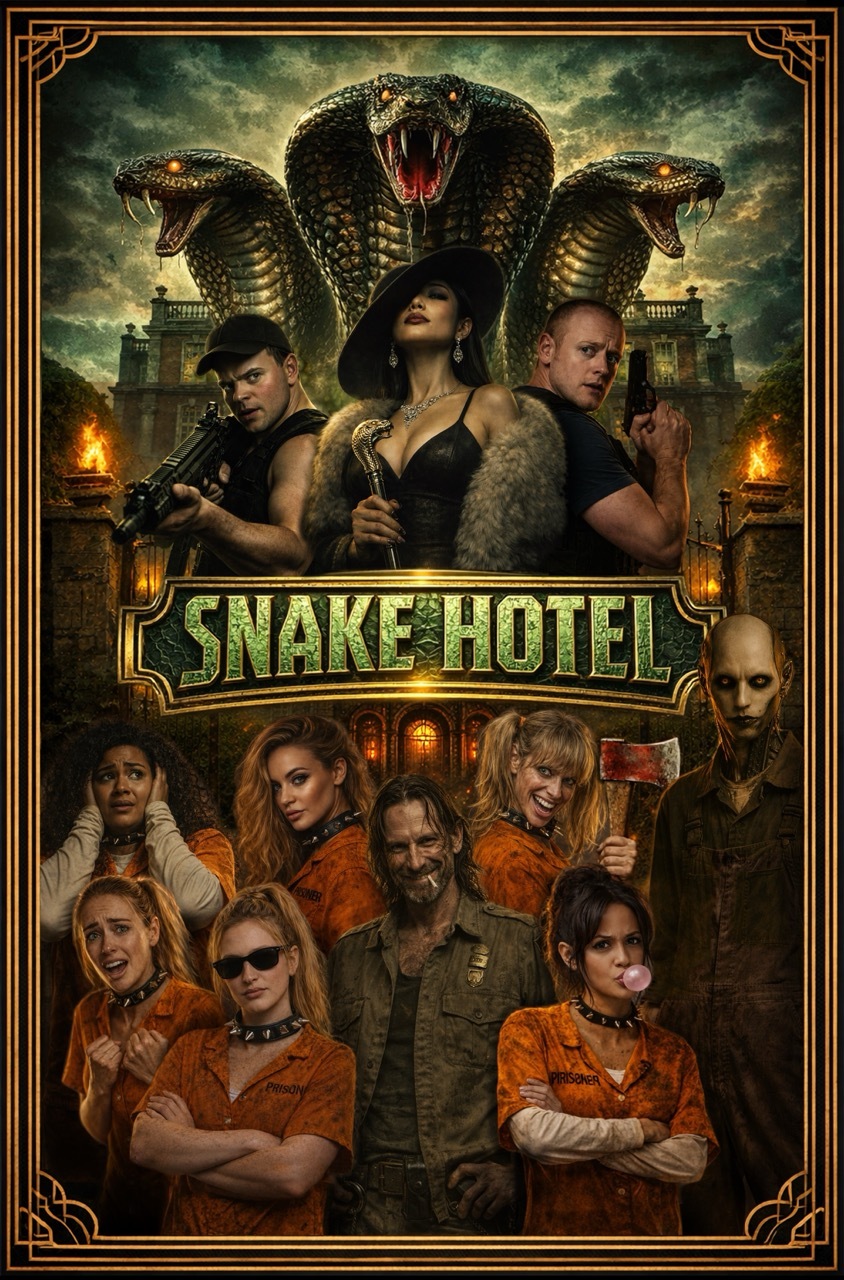 “We shot the entire film in seven days, averaging around 55 shots a day, inside an old English mansion just off the Welsh border. It was a true baptism of fire. The film itself was a deliberately wild, heightened fantasy-horror: six female convicts trapped in a hotel overrun by giant snakes, run by an eccentric, old-money dominatrix and her sadistic animatronic butler.