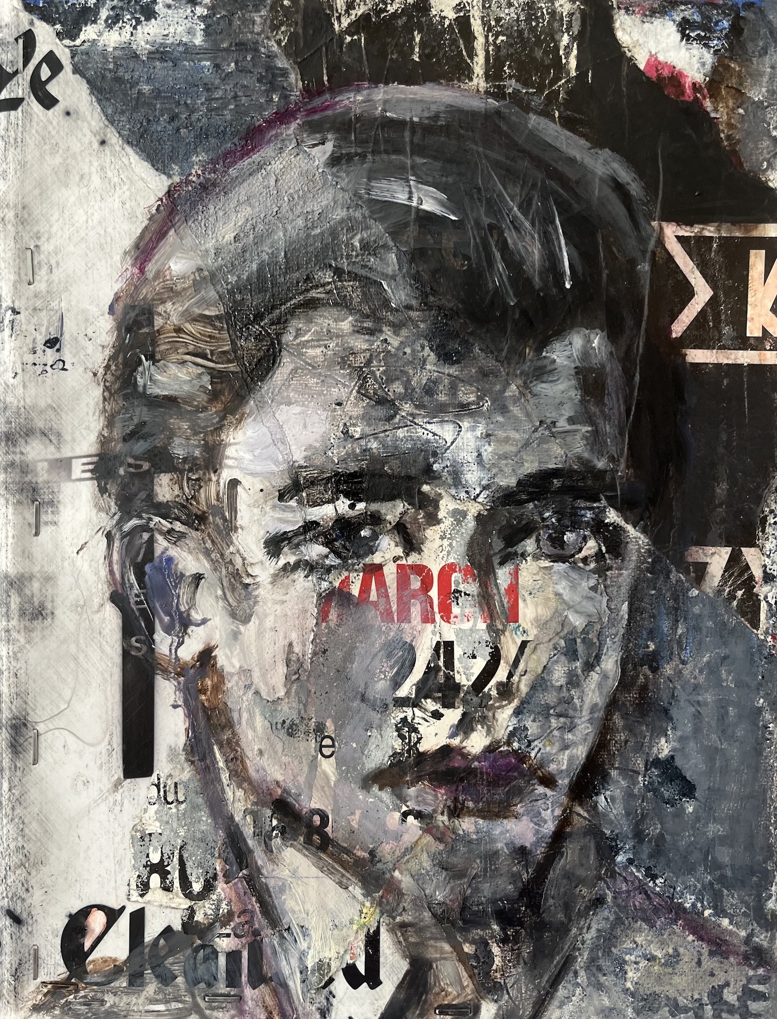 “This is a new challenge for me, I ordinarily paint directly onto the manufactured base tone of board, with no ground or previous contact, no primer, underpaint or sizing. I also have no idea of the condition of each painting until I have it. With each work, a new terrain of impasto paint, torn collaged paper, staples and text has been applied, glued, wrapped and layered onto the canvas for me to renegotiate anew each time.”