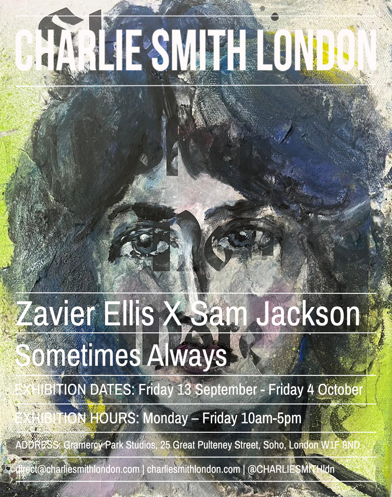 Zavier Ellis X Sam Jackson: Sometimes Always will open with a private view on Thursday 12 September at Gramercy Park Studios, Soho; opening to the public from Friday 13 September thereafter until Friday 4 October.