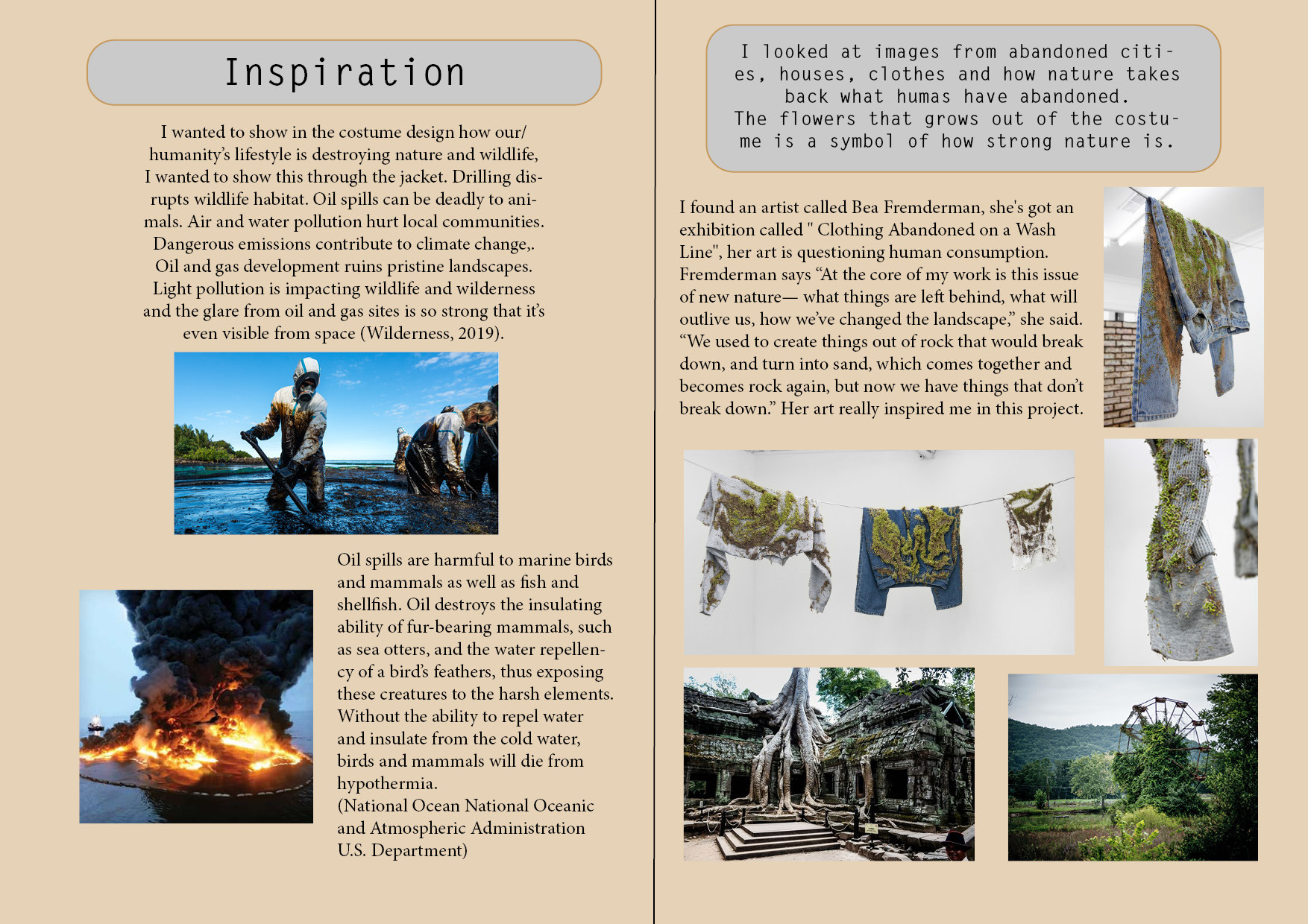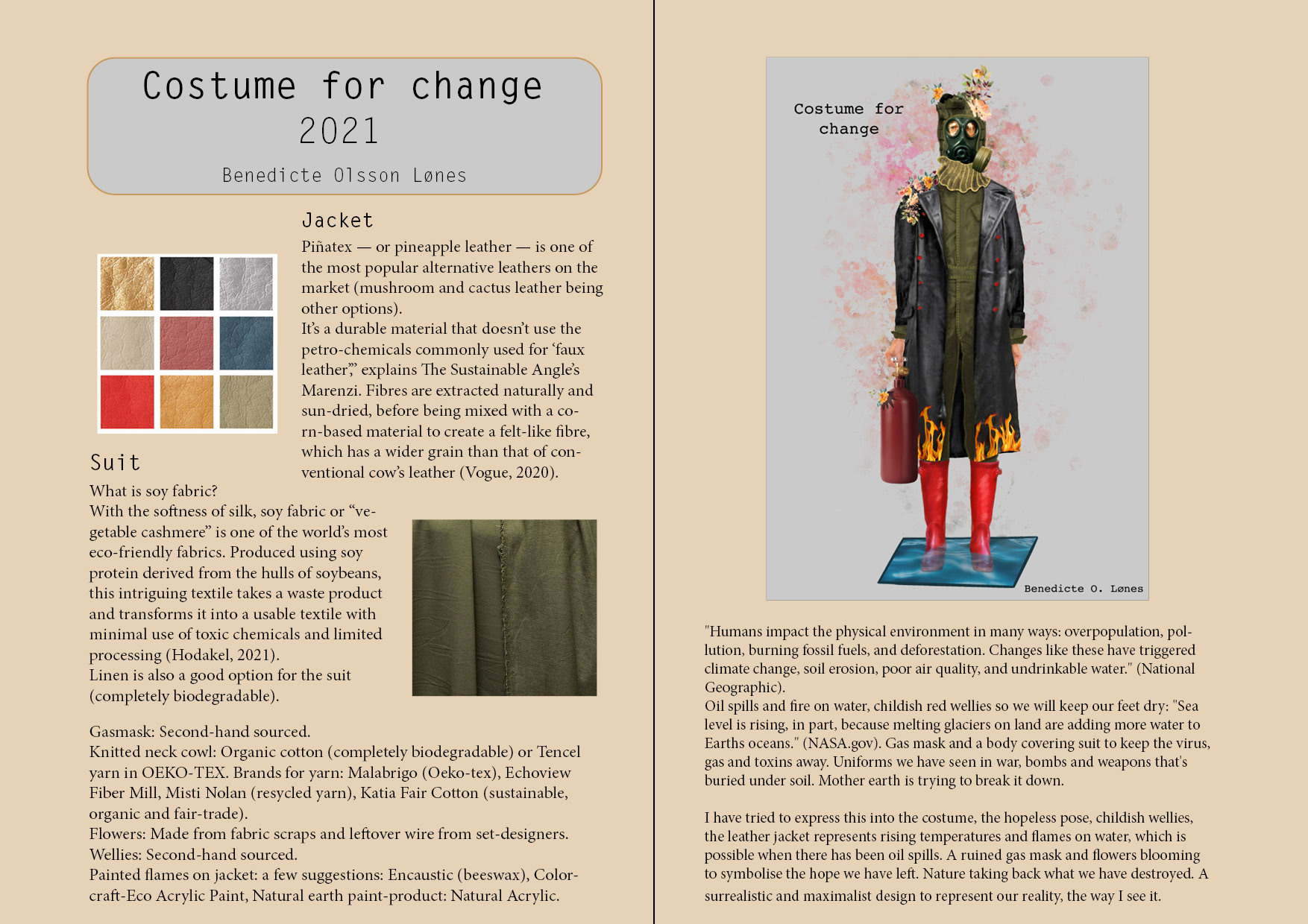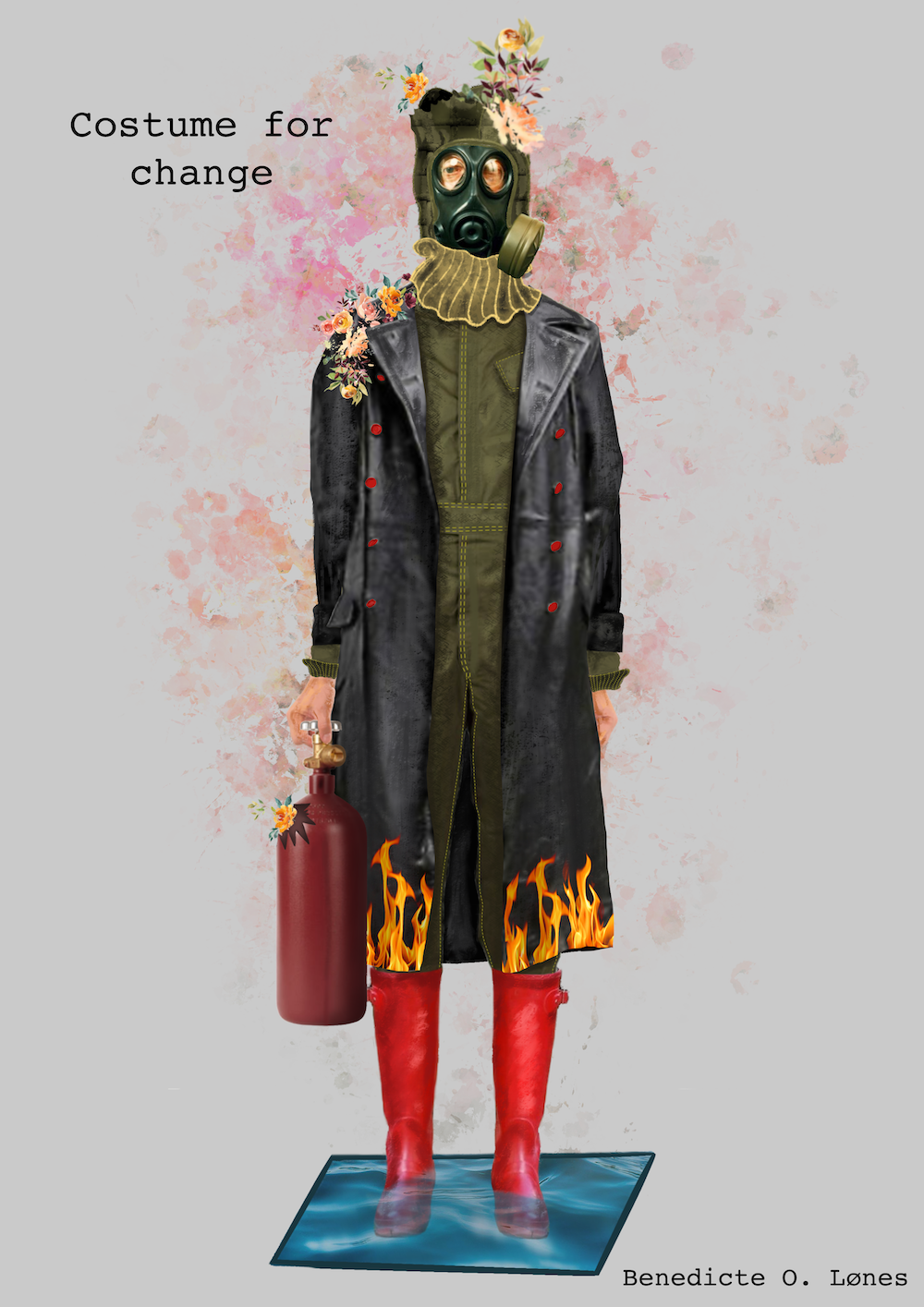 Benedicte is a 22-year-old vegan from Norwegian currently in her third year following the pathway of studying costume design. Her costume is inspired by the human impact on the environment, nature and wildlife. She designed a maximalist costume, with each component in the costume symbolising a different aspect of the climate crisis. The jacket is made from pineapple leather, representing oil spills, while the flames represent the rising temperatures on our planet. The red wellies are a symbol of humanity keeping our feet dry while sea levels rise. The gas mask and body covering suit is to keep us safe from viruses, toxins and gases. The flowers blooming from the costume symbolise the hope we have and nature's strength to take back what we have destroyed.