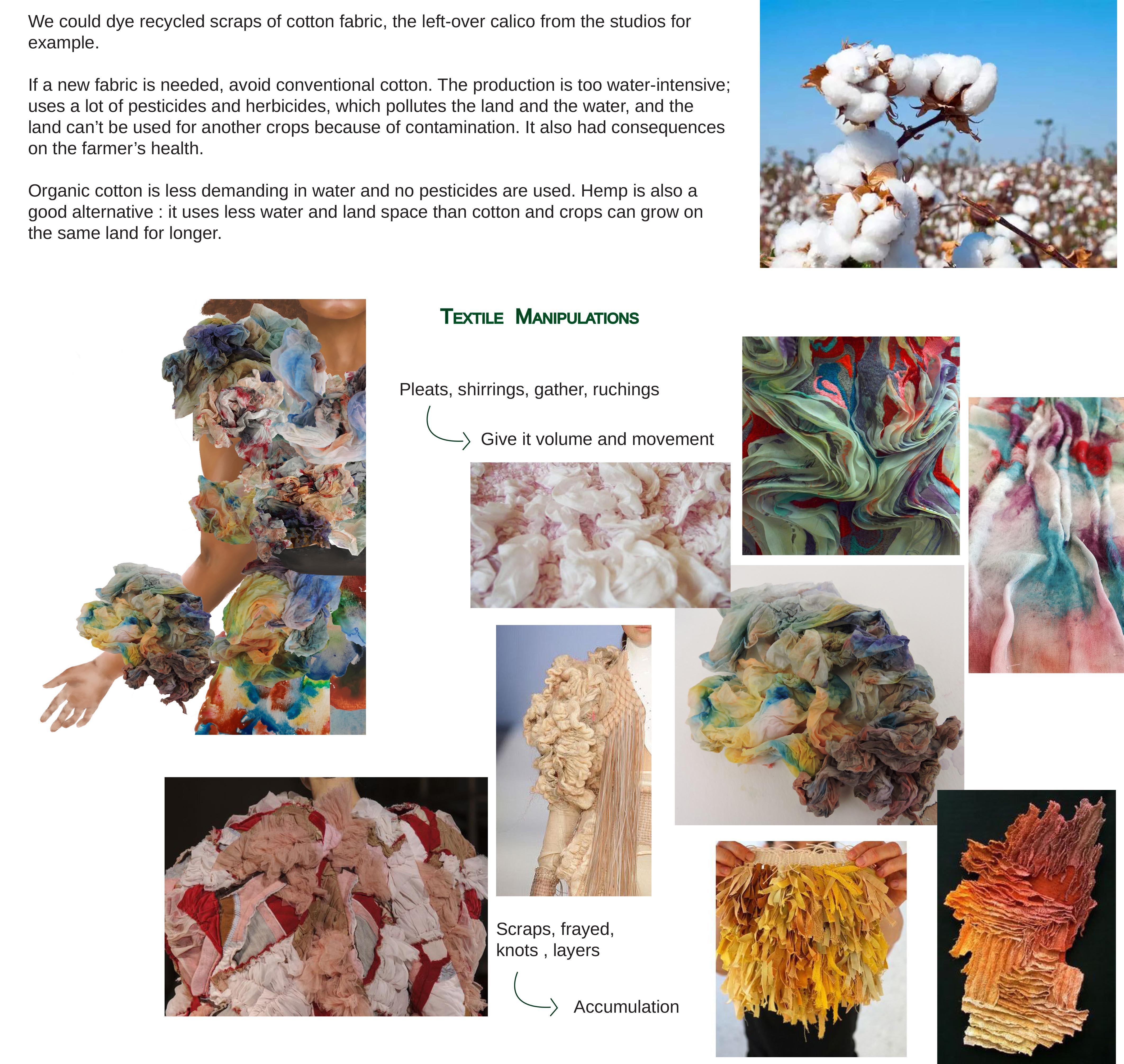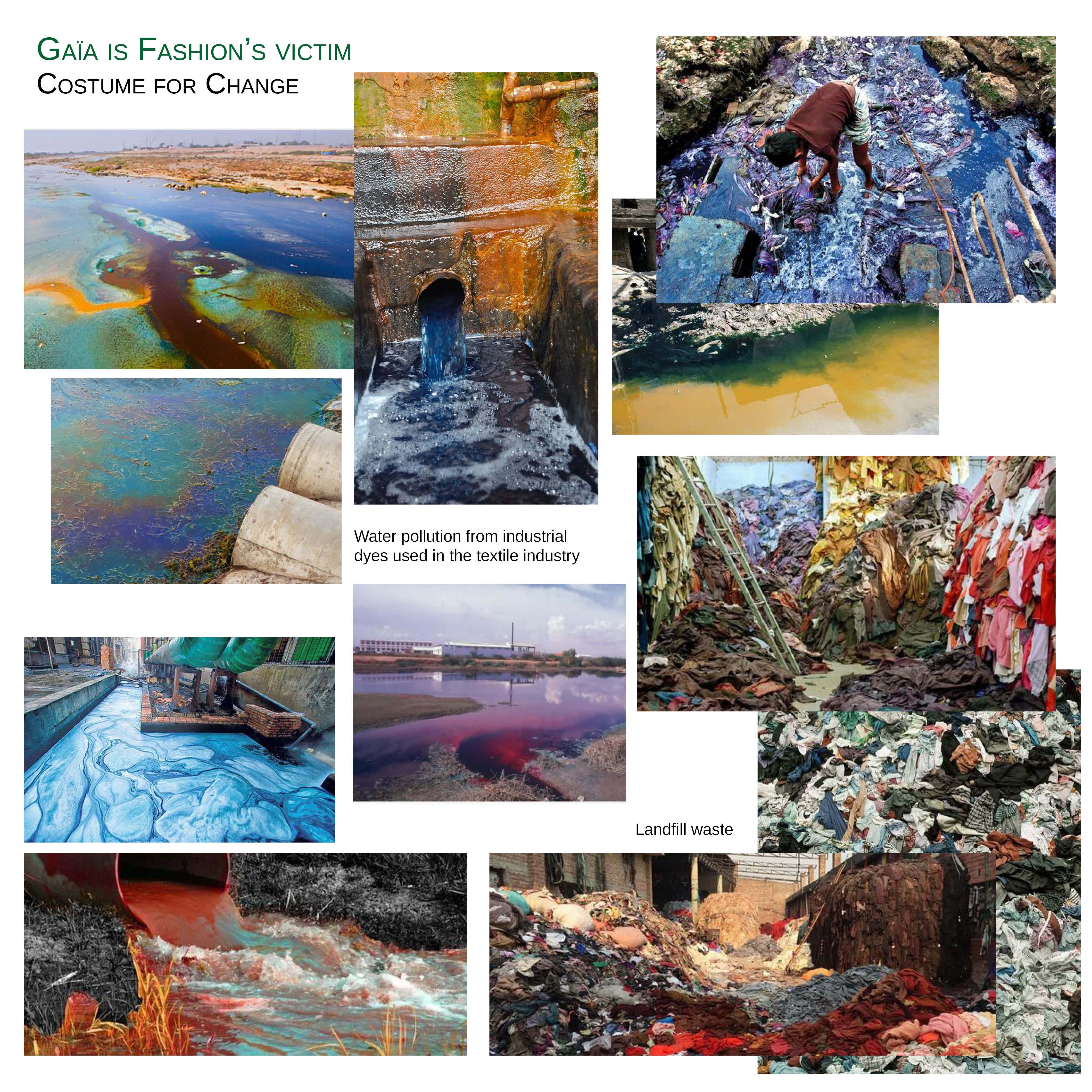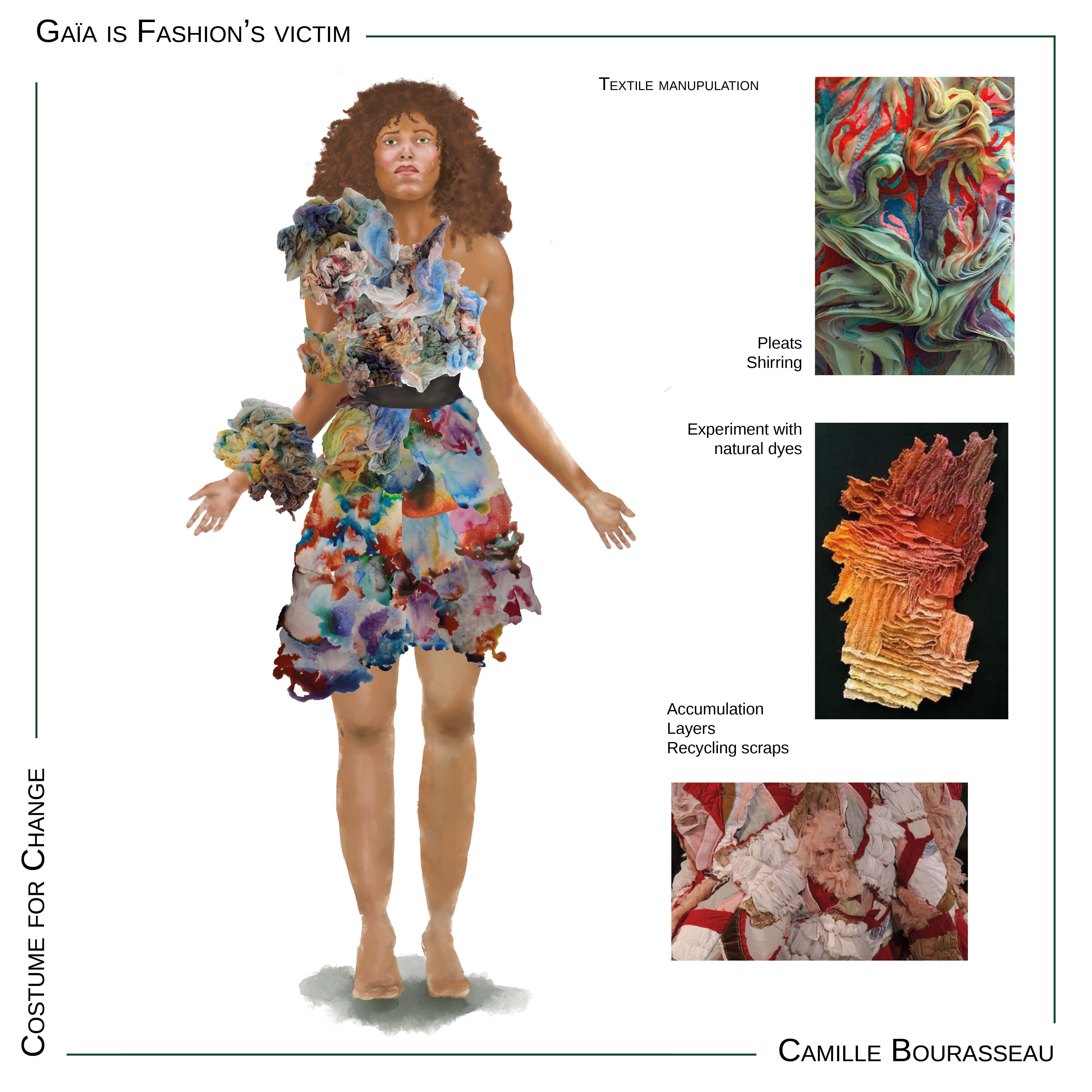 Camille is a third-year Costume Designer from France. Her design was created as a statement piece to raise awareness about the impact of the textile industry on the planet. She focused her design on water pollution caused by chemical dyes and fabric treatment, as well as the accumulation of unwanted garment ending up in landfills. The textile industry pollutes and wastes water during its creation and clothing left in landfill release toxic chemicals into the land. This costume explore the process of natural dyes including seeds, flowers, roots, plants, fruits and vegetables. The shape of the costume is inspired by the concept of the Hearth being progressively submerged by the colours of the dyes and the fabric accumulation from the landfills. Modelling the costume is Gaïa, the personification of the Earth in the Greek mythology. The shape of the dress is reminiscent of a Greek toga: draped, belted.