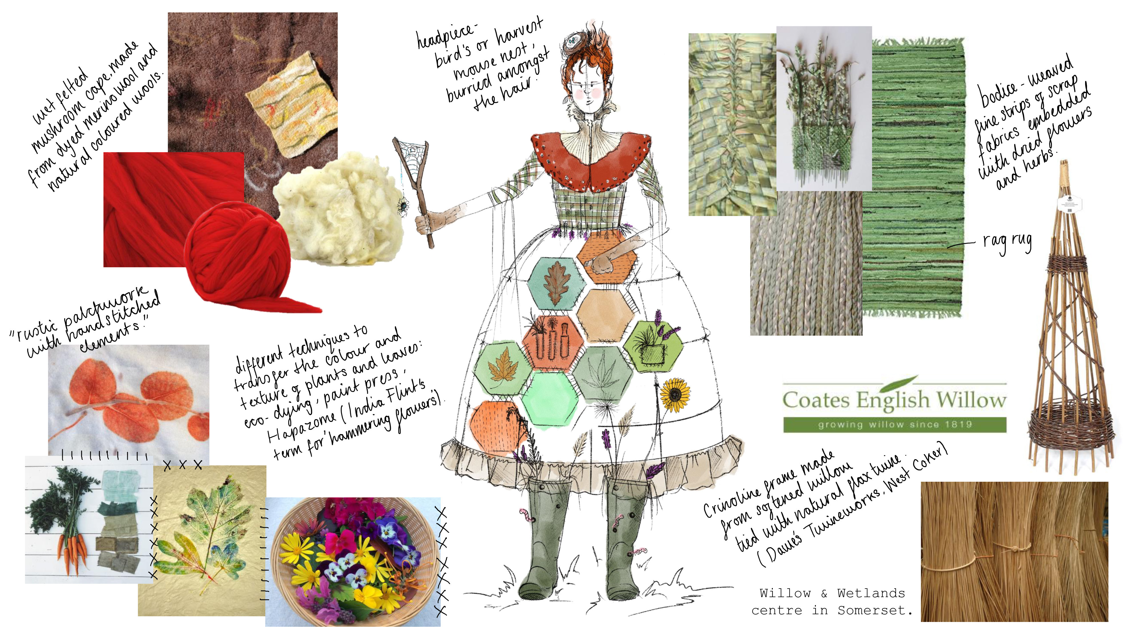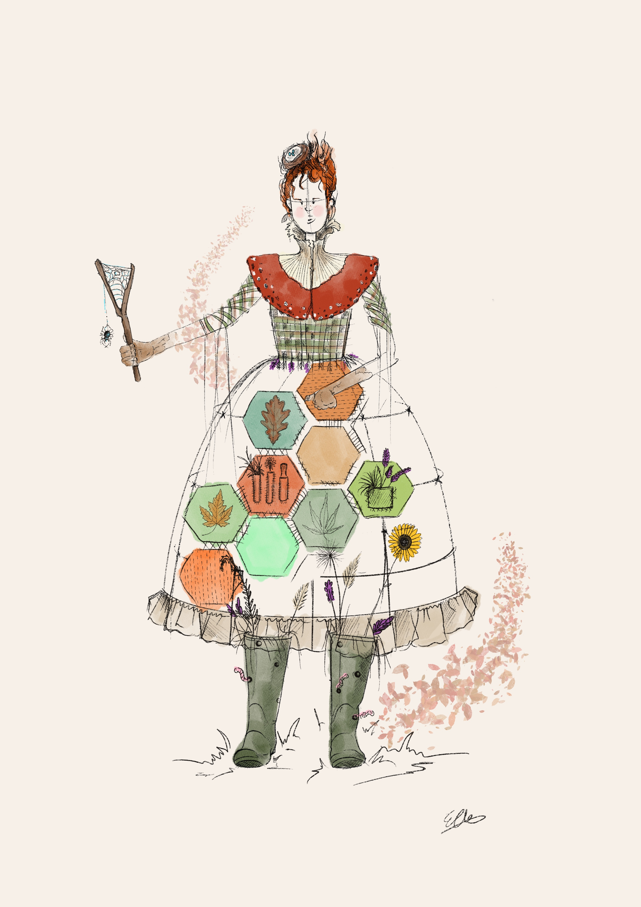 Ella is a second-year student on the Costume and Performance design course. Her costume design is intended to be an interactive, educational piece. It was inspired by a child’s ‘Welly-walk’, an exciting nature walk in which children can attach sticky materials to their wellies and see what is picked up as they walk through meadows and forests. The cape of the costume represents the forests and the mushroom fungi, made from a piece of wet felted wool. The dress takes its shape from a beehive and the shape of the honeycomb, which doubles as pockets for collecting seeds and nature treasures. The learning opportunities for all ages are endless. This costume has the potential to capture a lifelong interest in nature and the environment, be it habitats, pollination, climate or sustainability.