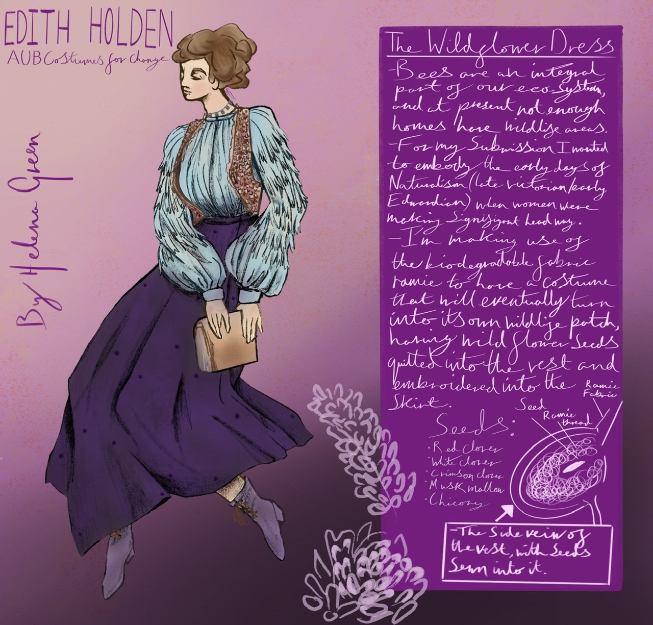 Helena Green is a second-year Costume and Performance Design student specialising in Design. Helena’s submission for the ‘Costume for Change’ competition is a costume with a purpose for good. Made from biodegradable fabric, the costume is inspired by naturalist and environmental painter Edith Holder from late Victorian/ early Edwardian period. The costume has a historical silhouette and is made from seed embedded ramie which will one day biodegrade, letting the seeds turn into wild flowers. The costume industry creates such waste but by using a fabric that biodegrades Helena wanted to show that the theatre industry can work with nature and still create amazing costumes.