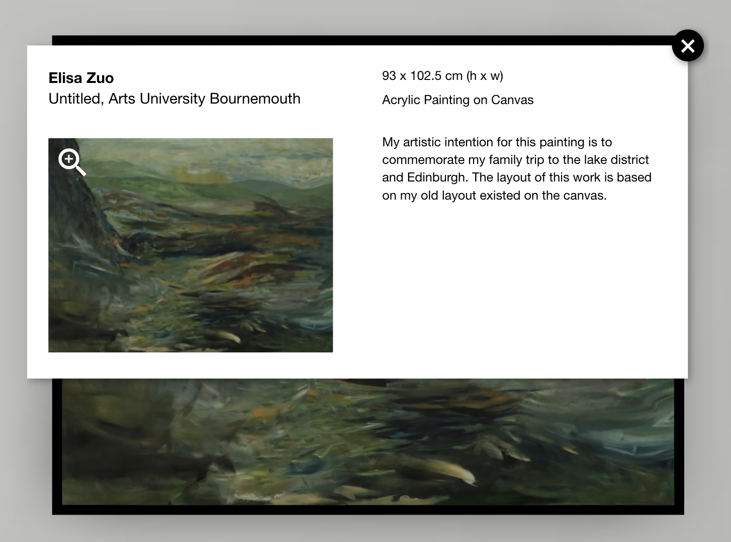 I am proud of an abstract landscape painting I made called Untitled (Scottish landscape), a piece I made to commemorate my family trip to the Lake District and Edinburgh. I was proud of this piece because it has made it to the Merge 2024 AUBSU x NUASU virtual exhibition. Projects I have worked on within the course this year include three portfolios, two presentations and one essay. Some projects I have done with my passion in abstract photography are called "abstract light within nature".