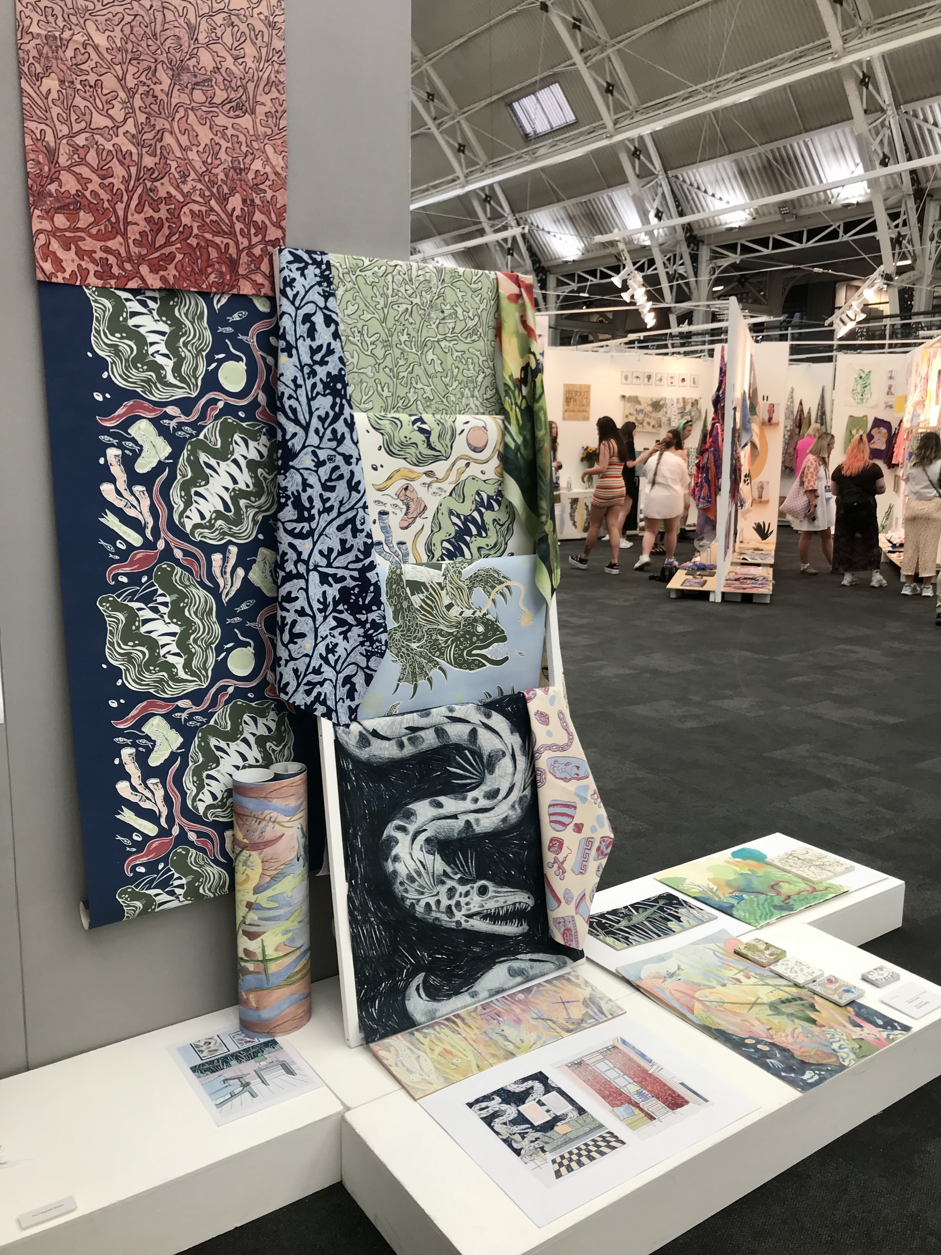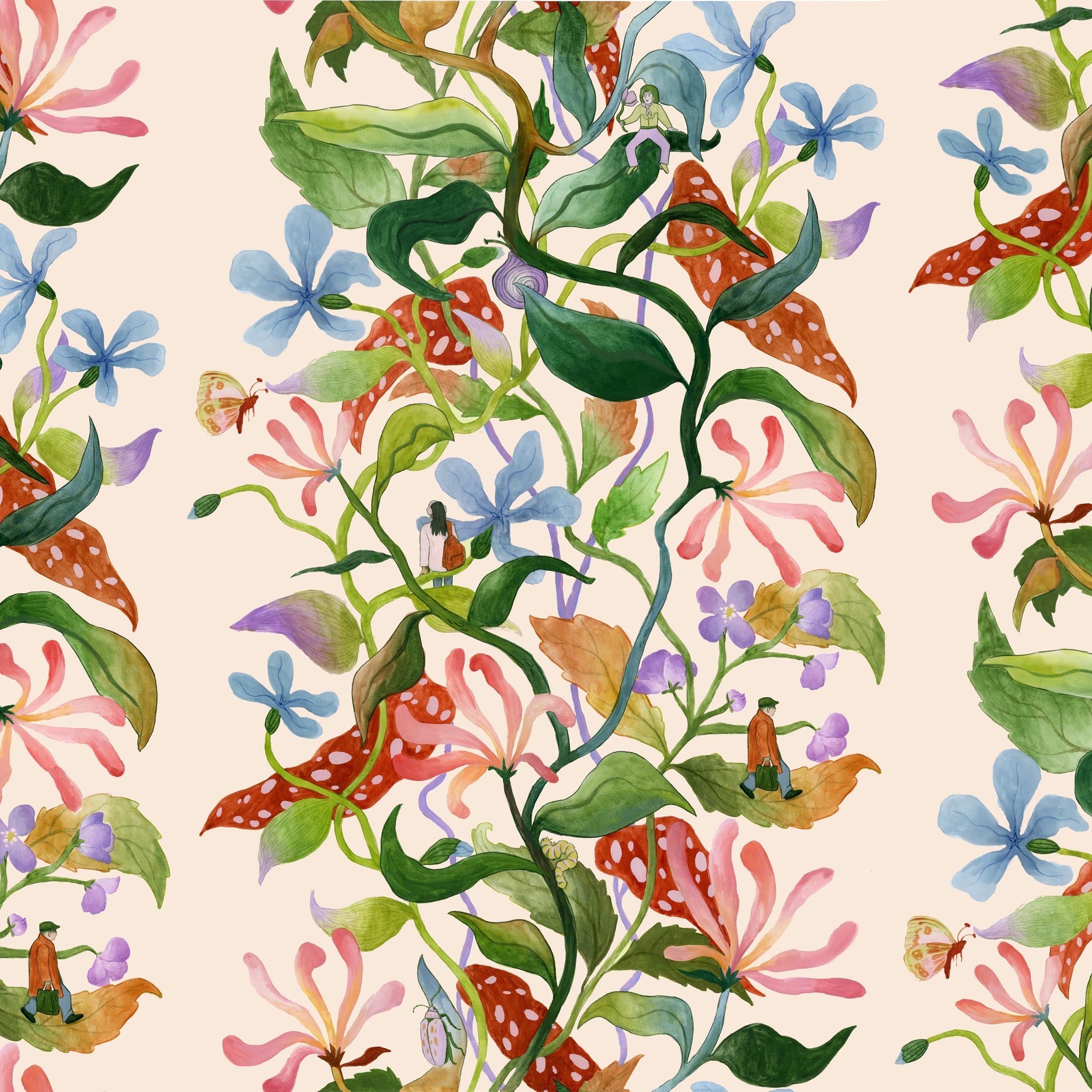 During her time at AUB, she specialised in screen-printed repeat patterns for interior fabrics and wallpapers. With a love of hand painting and storytelling, her work often features colourful illustrated scenes inspired by local flora and fauna.