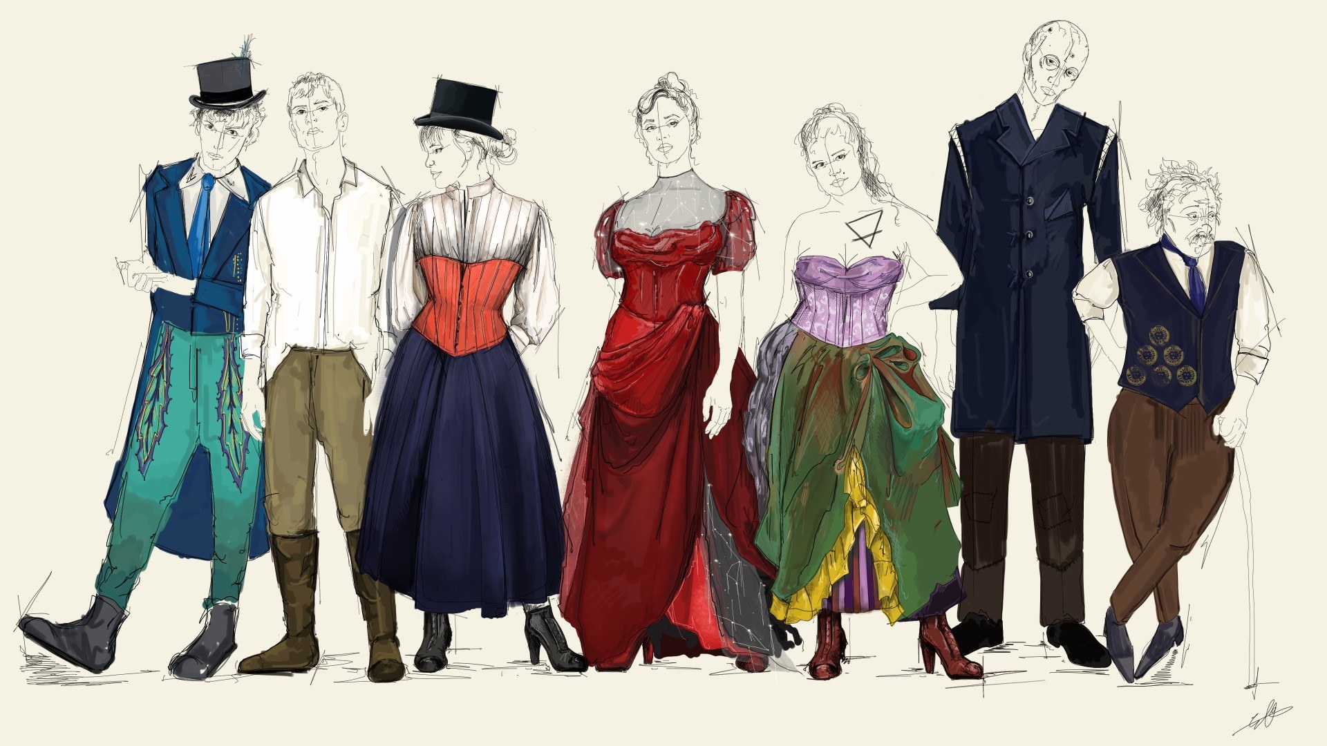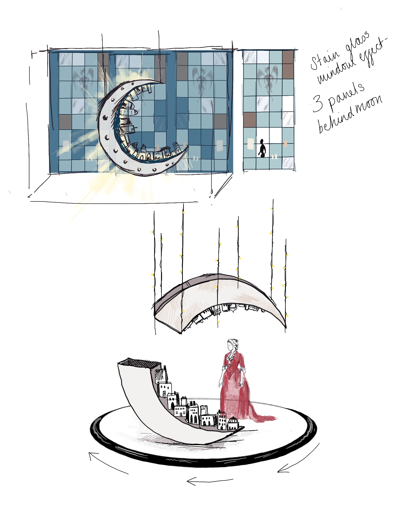 I wanted to expand my understanding on the subject, and began this project digitally, which takes me to my third reason. I recently bought myself an iPad, and with it the digital drawing app Procreate. Over lockdown, practising drawing and painting has been really enjoyable – digital drawing offers amazing precision, and requires just as much effort and skill as analogue drawing. In order to develop my skills throughout this unit, I designed all my sets and costumes in Procreate, which I’ve found both incredibly rewarding and challenging. But as we move into an increasingly digitised world, I feel as though I am learning an essential skill set.