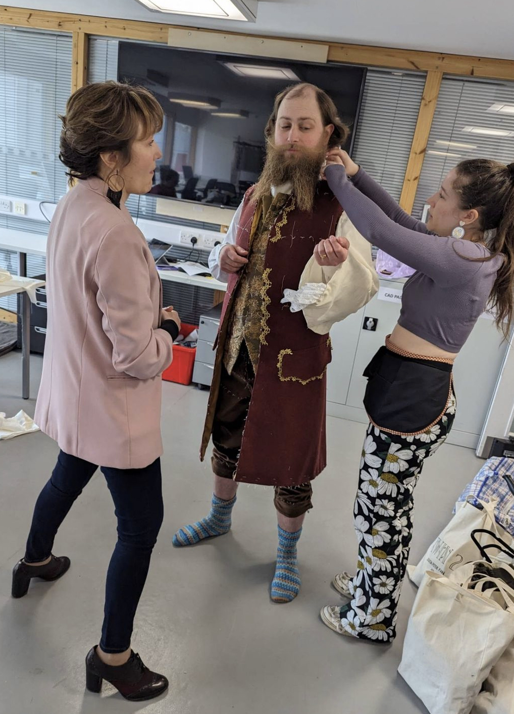 I started by drafting a 1780s-style coat, but then altered it to be in the 1730s style, which had lots of pleats in the coat's skirt. My actor really liked this in the fitting, as he commented that he now got to spin his skirts like girls in their dresses! The budget we had for this project was initially quite small, so a lot of the decoration was donated. The gold trim decorating the coat was all donated, and I cut and manipulated them to fit the desired look for the coat. Sewing it on was quite time-consuming, as they were separate pieces, rather than a long strip of trim. However, I am really pleased with the final outcome as I think the gold looks very effective down the front, paired with the gold buttons.