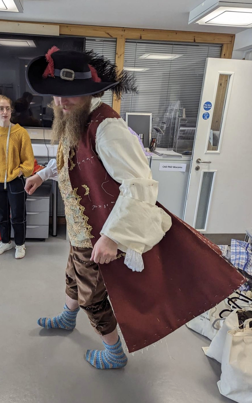 For my major project in BA (Hons) Costume, I made a full Captain Hook costume for SISATA Open Air Theatre’s touring production of Peter Pan, taking place this summer. The company asked for four costumes to be custom-made by the course for Peter Pan, Wendy, Tinkerbell, and Captain Hook. I made the one for Captain Hook, which included a shirt, breeches, waistcoat, coat, and cravat.