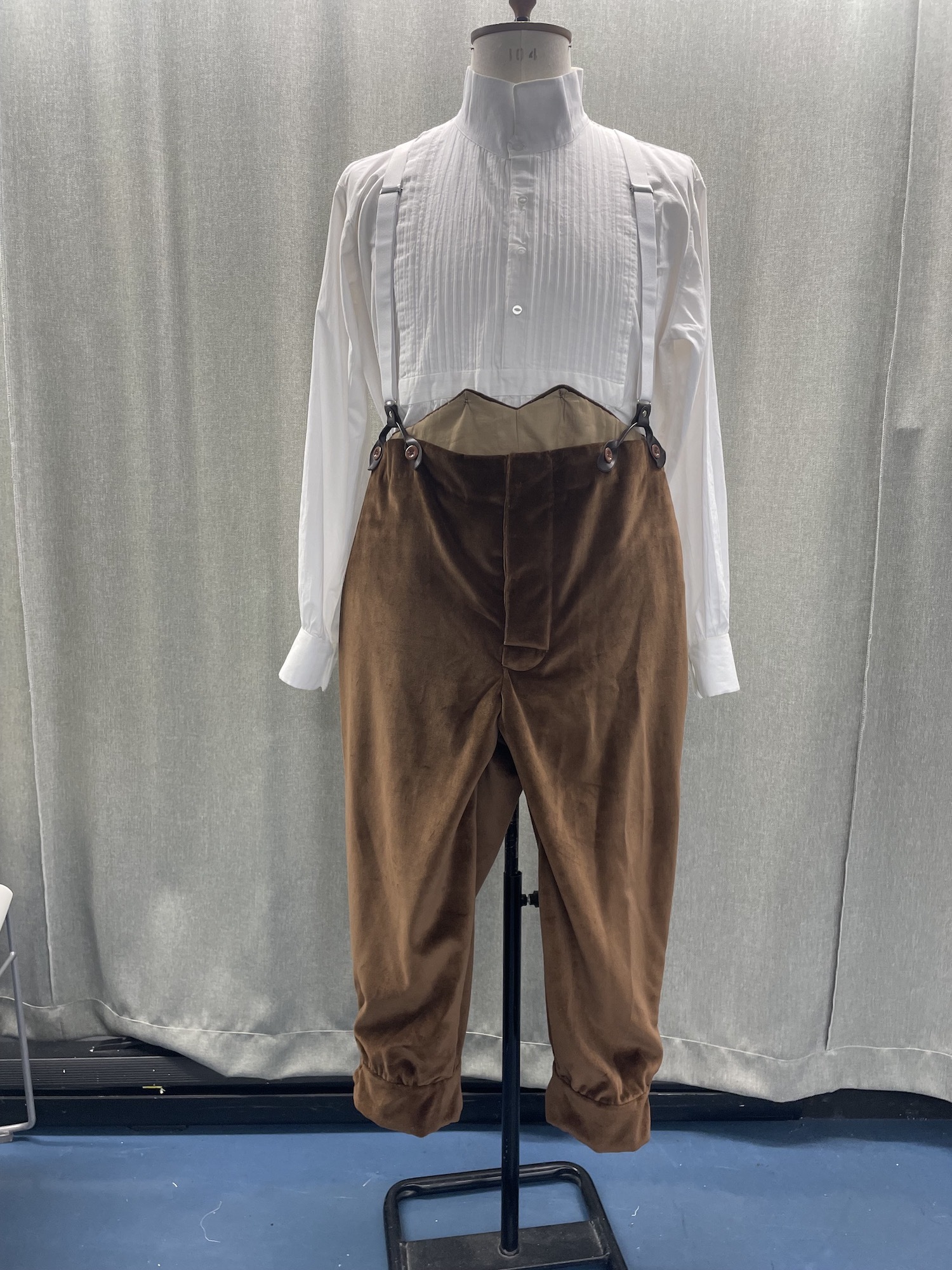 To make the shirt and breeches, I drafted a base pattern using the actor’s measurements and then altered them at the fitting. I enjoyed making the shirt as it included a lot of new techniques, including a pin-tucked bib front, sleeve plackets and a stand collar. I had to sample these techniques many times as they were quite technical and fiddly, so I had to practise making them neat. The most important factor for the shirt was making sure it was crisp and neat, so I pressed the shirt at each stage of construction to make sure it stayed as creaseless as possible. Making this type of shirt was very helpful to me as it had a lot of similarities to modern-day shirts over pre-19th