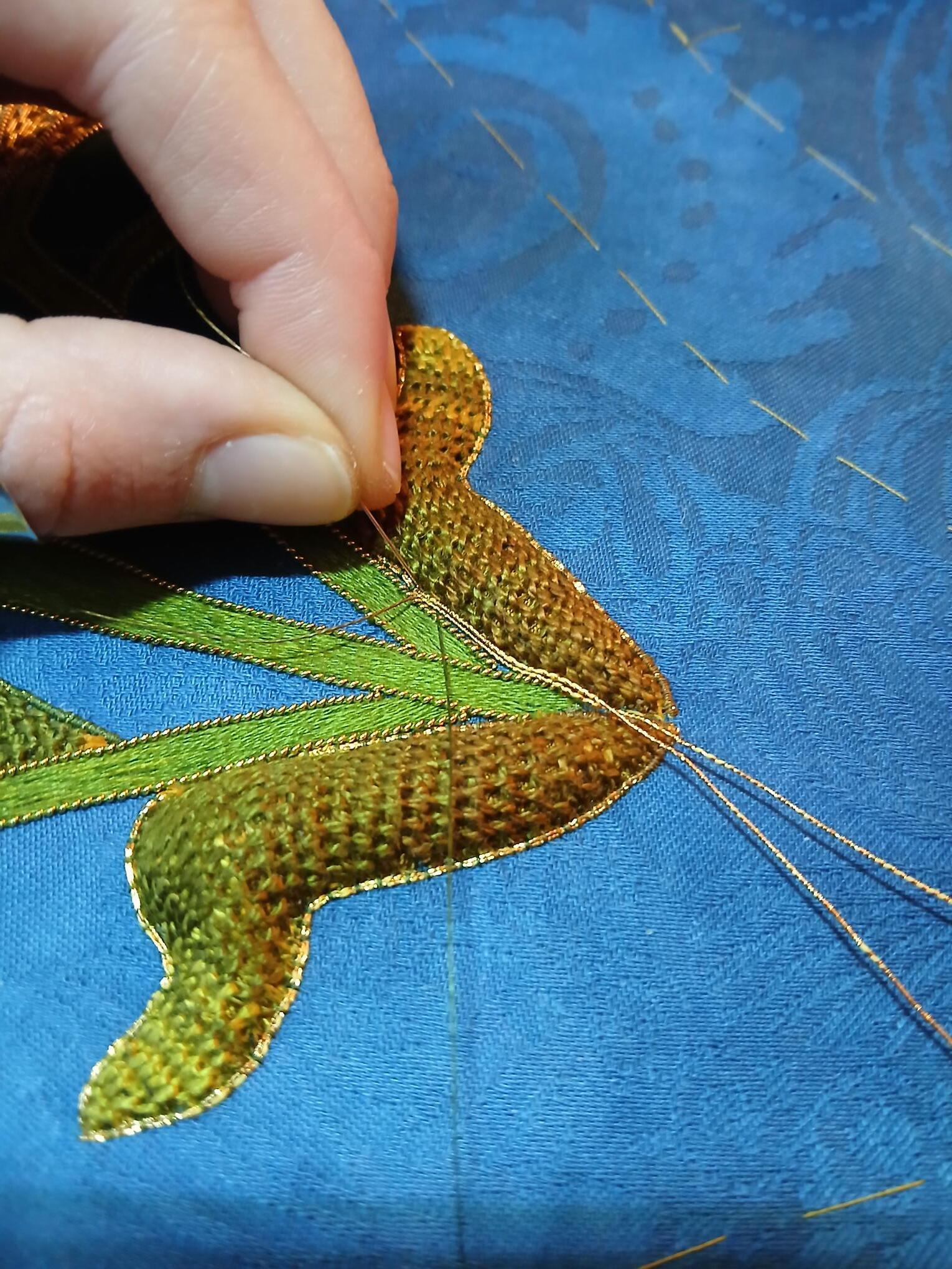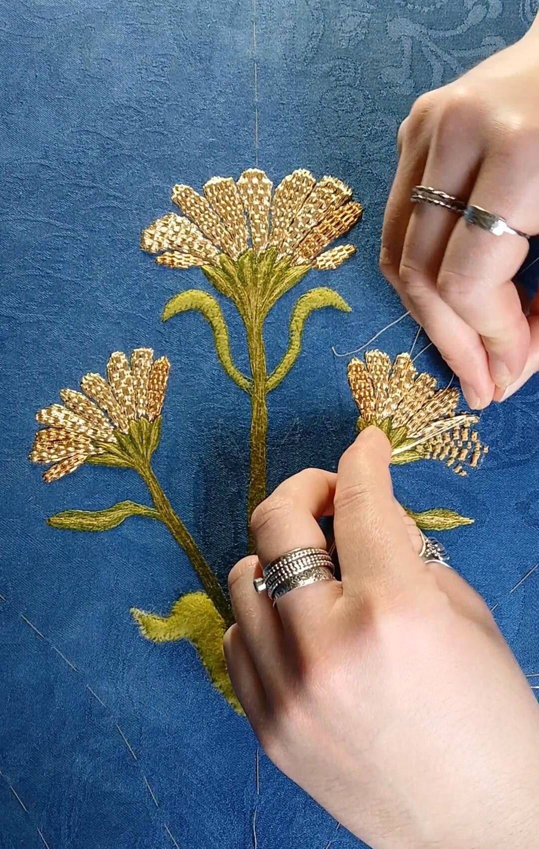 In the beginning there was a lot of sampling involved using varying techniques of the ancient process of indigo dyeing, in order to achieve the desired shade of deep blue. Once this was achieved, sampling for the embroidery became the next step. With my colour palette and design finalised, I took to sourcing varying shades of gold wires and threads to give the marigolds depth. During this process I decided to incorporate shades of olive greens and green golds to enhance the design details.