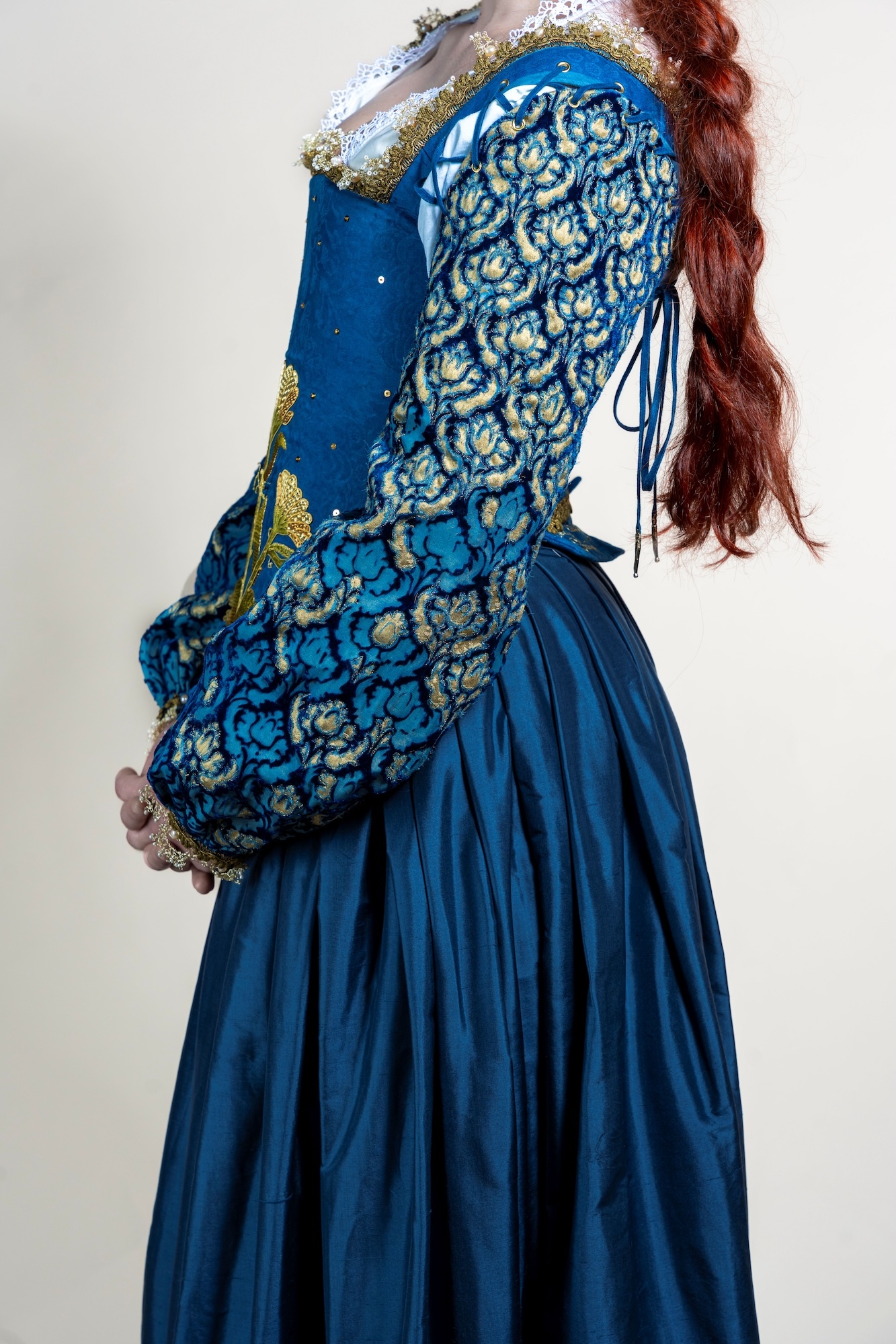 I made the bodice to my measurements, therefore fitting it required an extra pair of hands and eyes to assist, which proved challenging at times. On another note, creating a sleeve pattern that not only somewhat honoured the 16th century style, but also allowed for the textile technique applications of devoré, screen-printing, free motion embroidery and slashing.