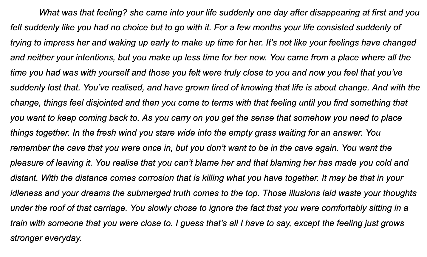 Most of my writing begins with fragments – a phrase or a fleeting thought scribbled down in a notebook or on my phone. These often grow into stories. I can’t write from nothing; everything I have written is rooted in something I’ve experienced, and in the quiet tension I carry inside. A lot of the time I can’t write a single paragraph, until I write something where there is that first spark and suddenly, I find myself writing for days until I have completely drained myself of that idea.