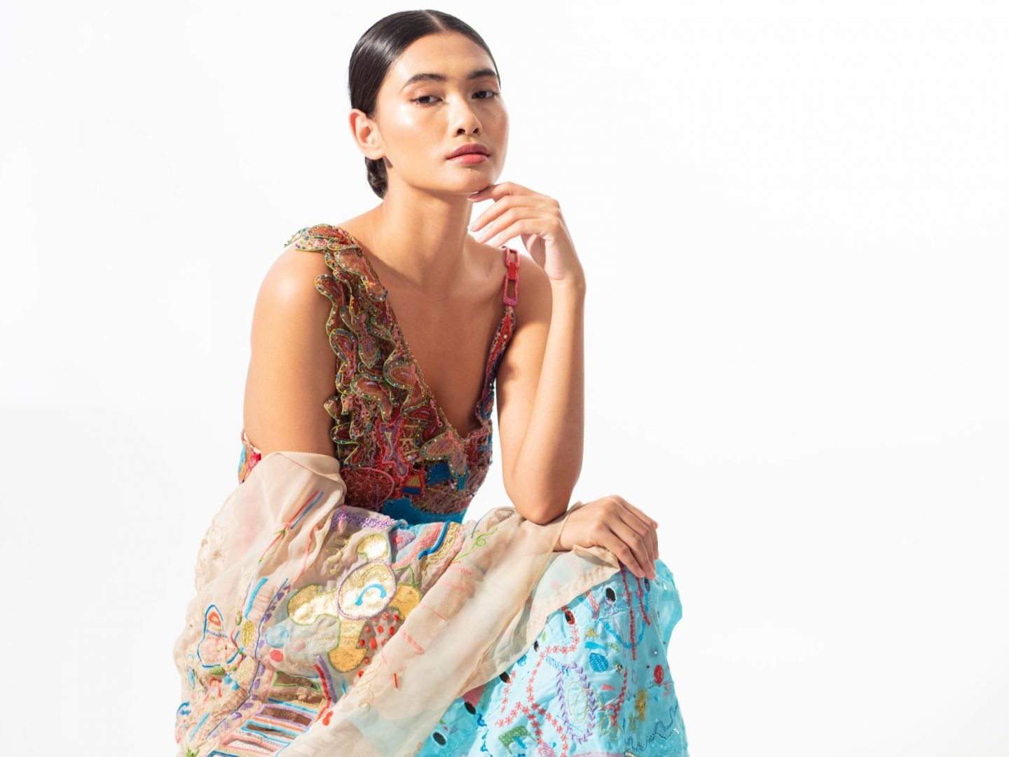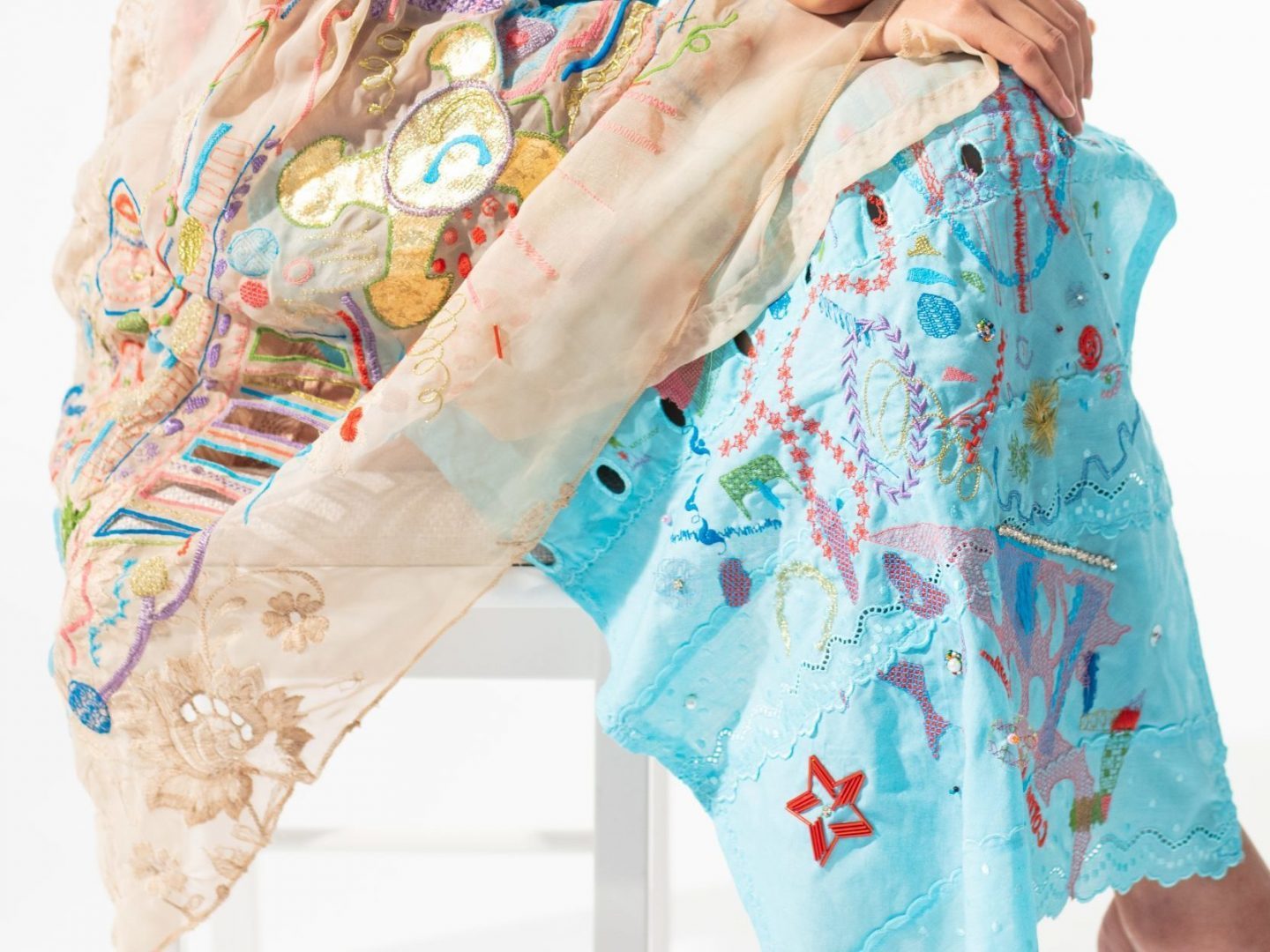 Eve’s collection Player, has been inspired by abstract art using jungle gym formations, influenced by 90s lingerie, and encompassing themes of playfulness, innocence, and romanticism. The collection used digital embroidery, along with upcycled elements of lace, tulle, curtain, ribbon, gold leaf, rhinestone, and sequin.
