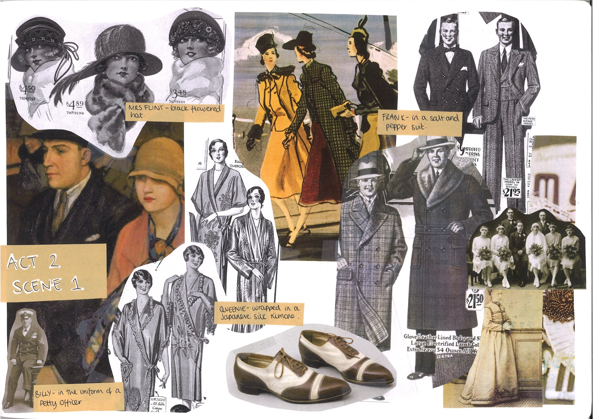 The first term was the initial design process where I began gathering my research, inspiration, discussions with the director and his vision and then I started my sketches. In total, this play required 60+ costume designs! The play was set between the two World Wars (1919–39) in Clapham Common, London, so I spent a lot of my time in the library analysing the silhouettes of that period, photocopying from original '20s/'30s fashion magazines. I then start compiling these all into my sketchbooks which really helps me to visualise the overall essence of that scene or character, which I later have next to me when I draw my designs.