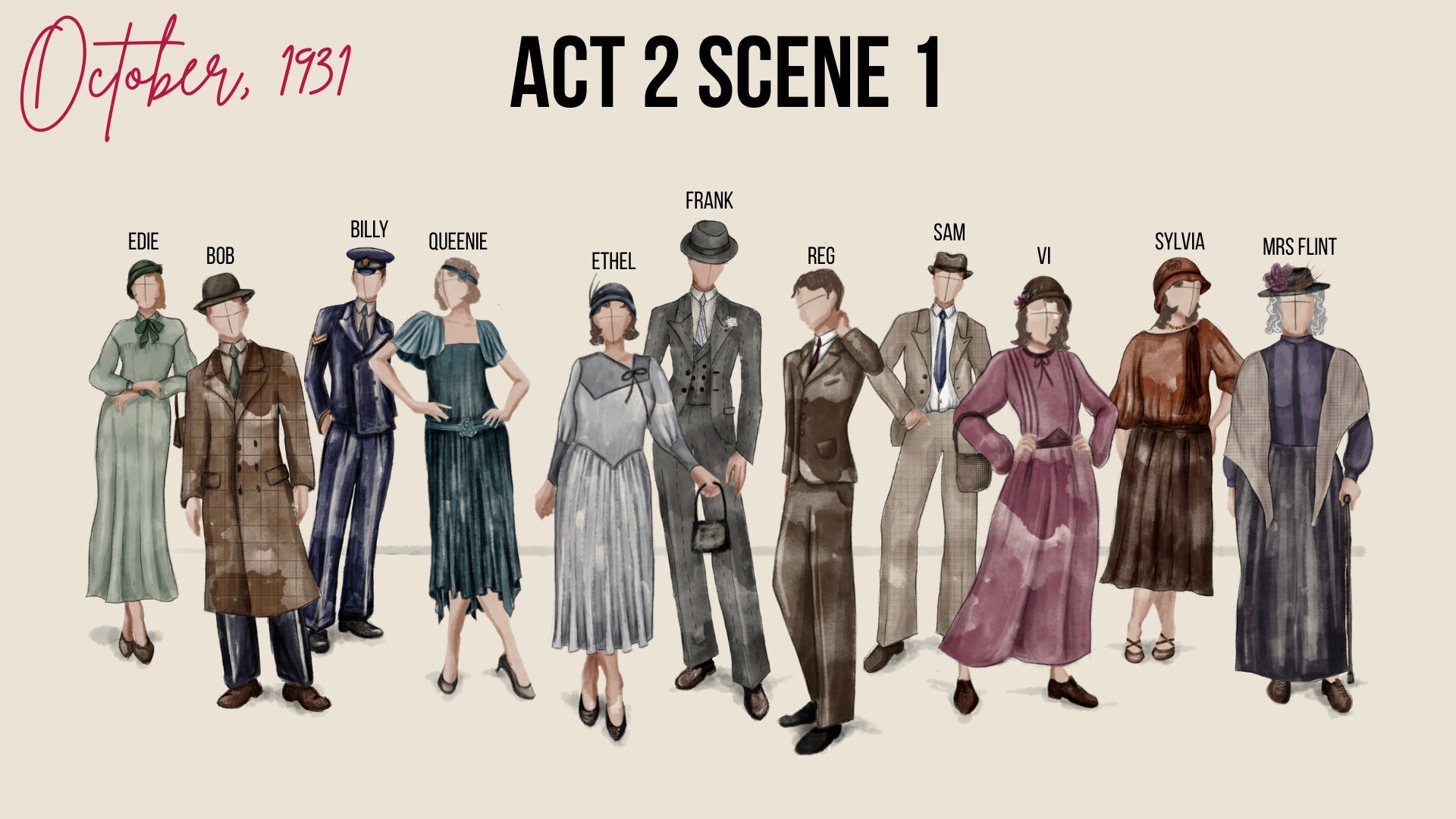 After exploring a variety of pathways within performance design in first and second year, I decided for my final year I wanted to specialise in purely costume design for both theatre and film. For my Final Major Project, I wanted to put myself forward for lead costume designer for one of the AUB Productions: This Happy Breed.
