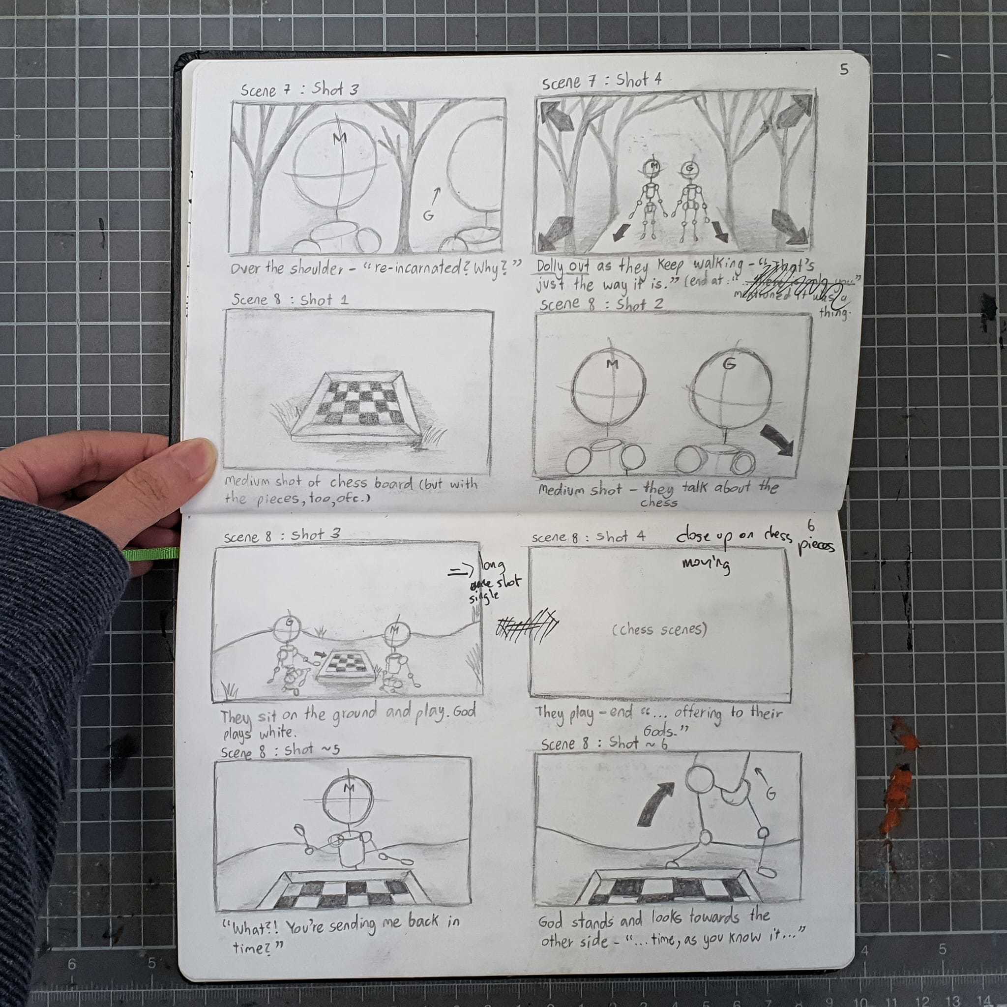 “The original idea for the final project was a ‘talkie’ short film where two celestial beings argue opposing opinions on the state of the world and what its future should be over a game of chess,” explains Daniel.