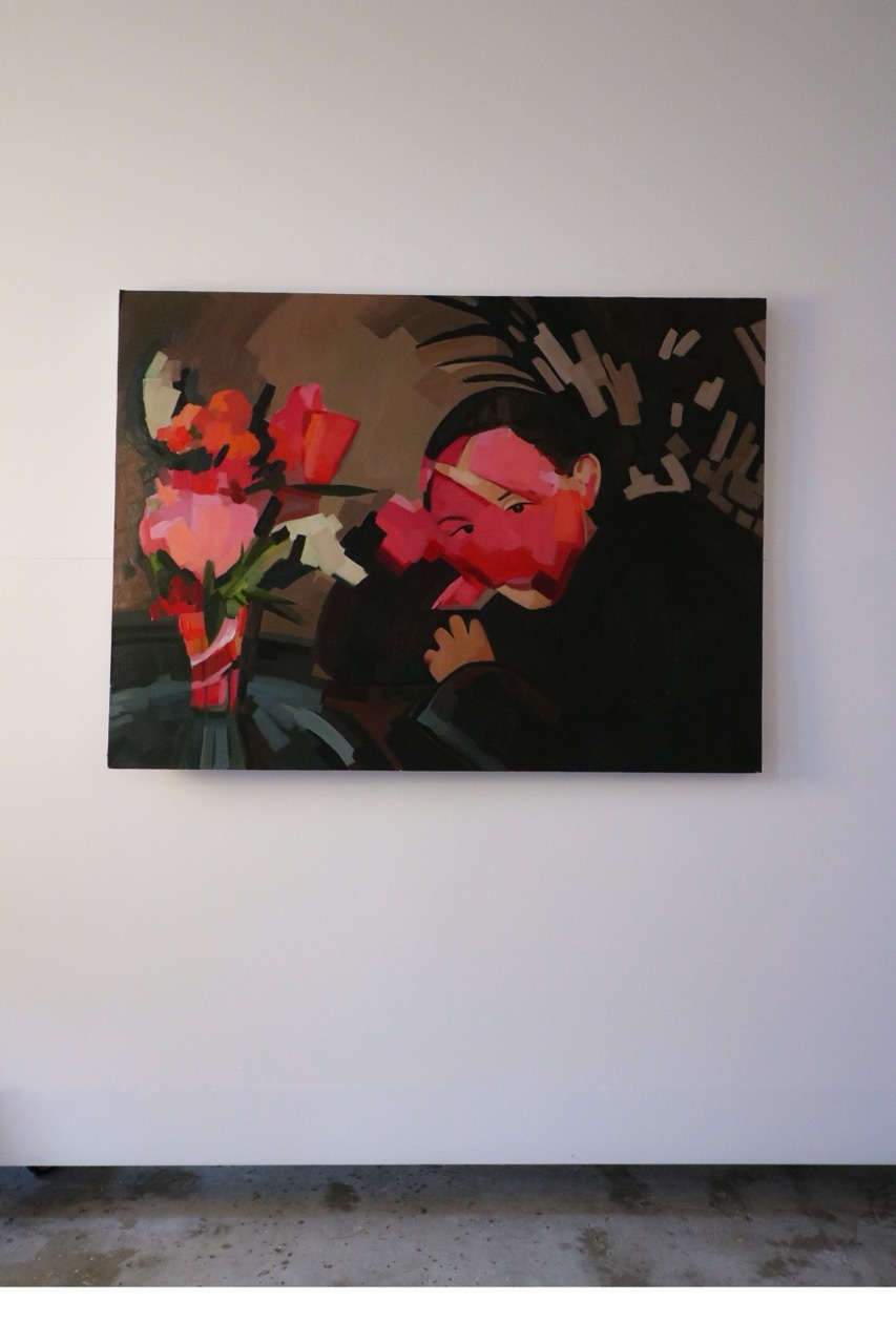 Then I take the digital into the physical by working into large canvases, starting with layers of ink and acrylic washes that will peek out from underneath final oil paint and oil bar layers. Working on large canvases allows me to foster a more fluid paint process, where it gives the opportunity for the material to show off its true qualities.