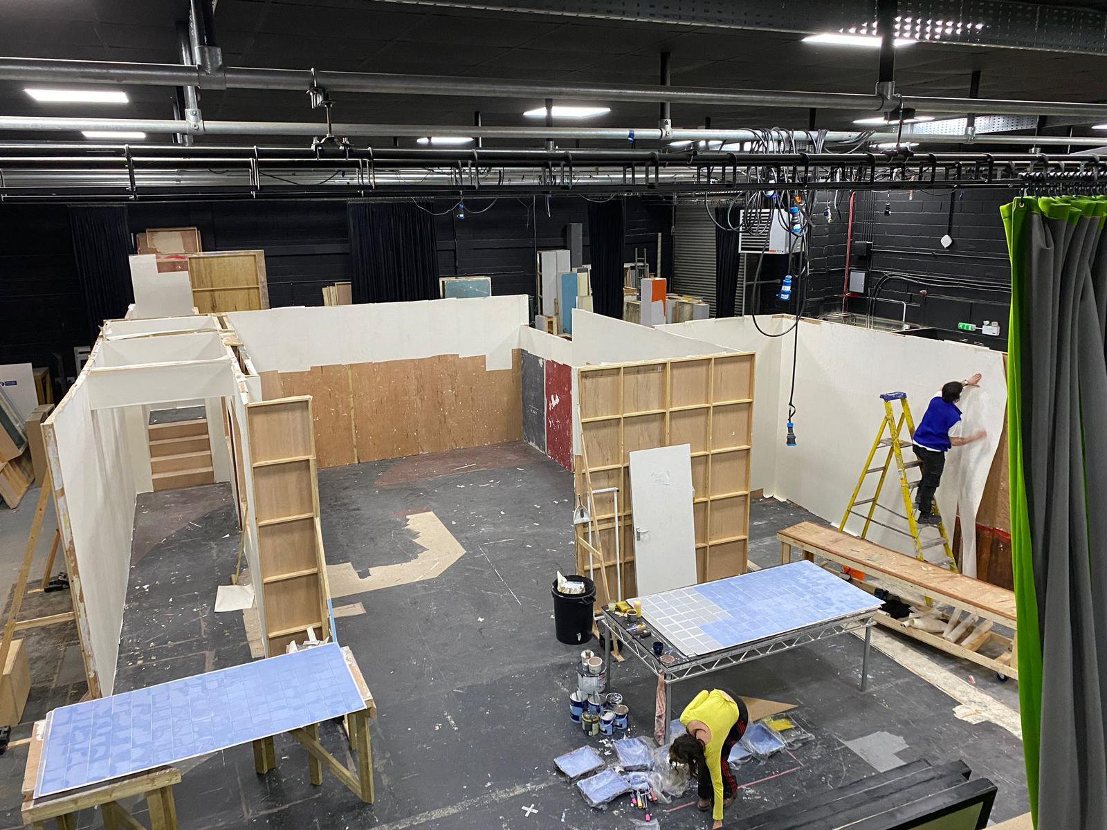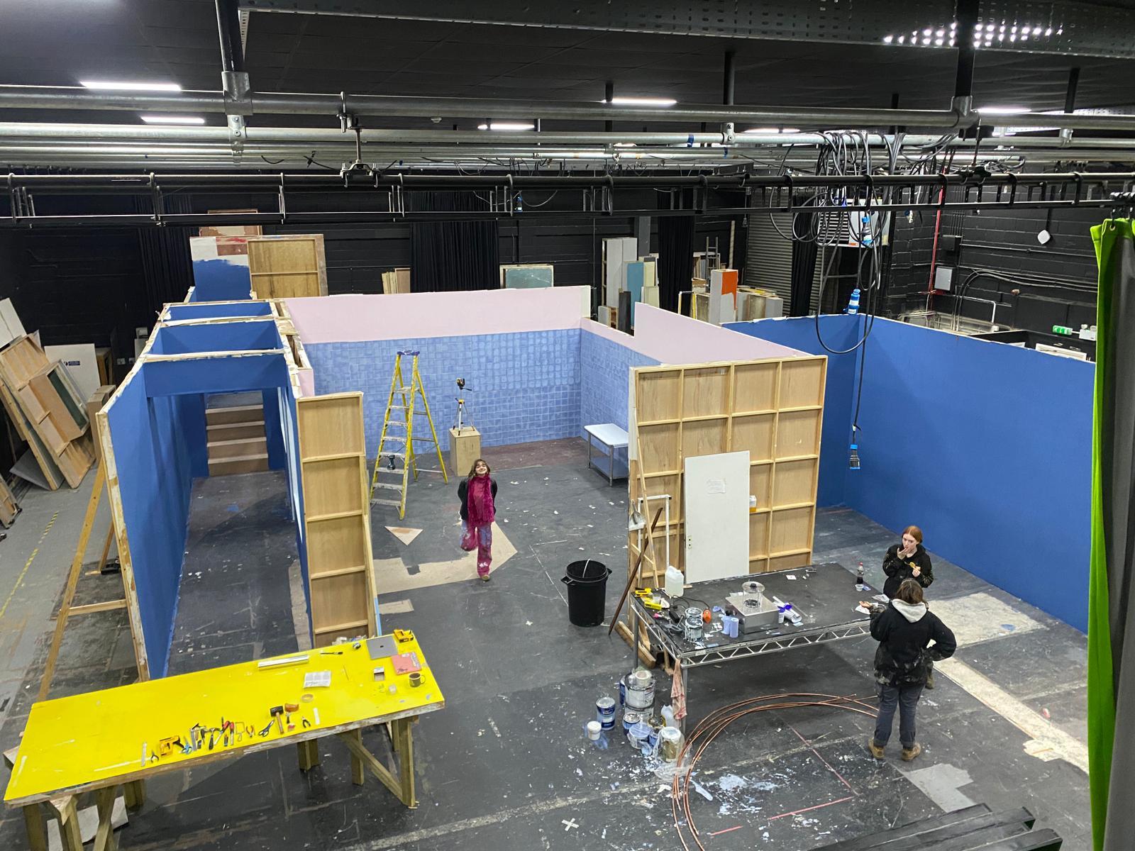 For Mourning Glories, we crowdfunded to build a stylised mortuary. Using the course's staff of industry professionals and resident technicians, we designed and constructed a set that was as close to a professional standard as was possible within our budget of £2,700. We decorated the space with ornate, hand-painted wall and floor tiling, custom-built cabinet units, large open windows, a practical staircase and even hired in some professional medical props. This was a brilliant chance for us to showcase the skills we had developed over our three years – scenic painting, carpentry, prop building, set decoration and visual storytelling.