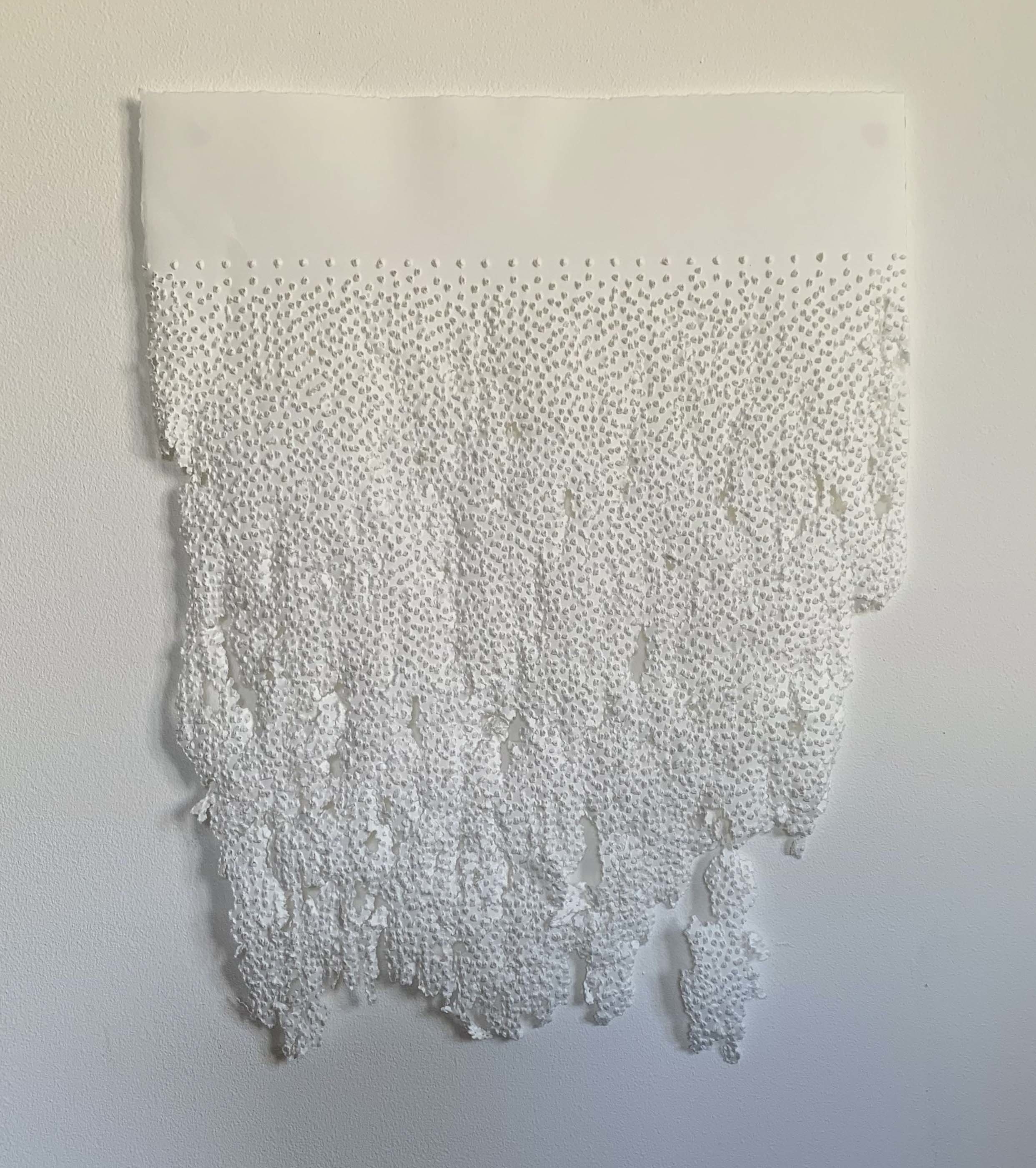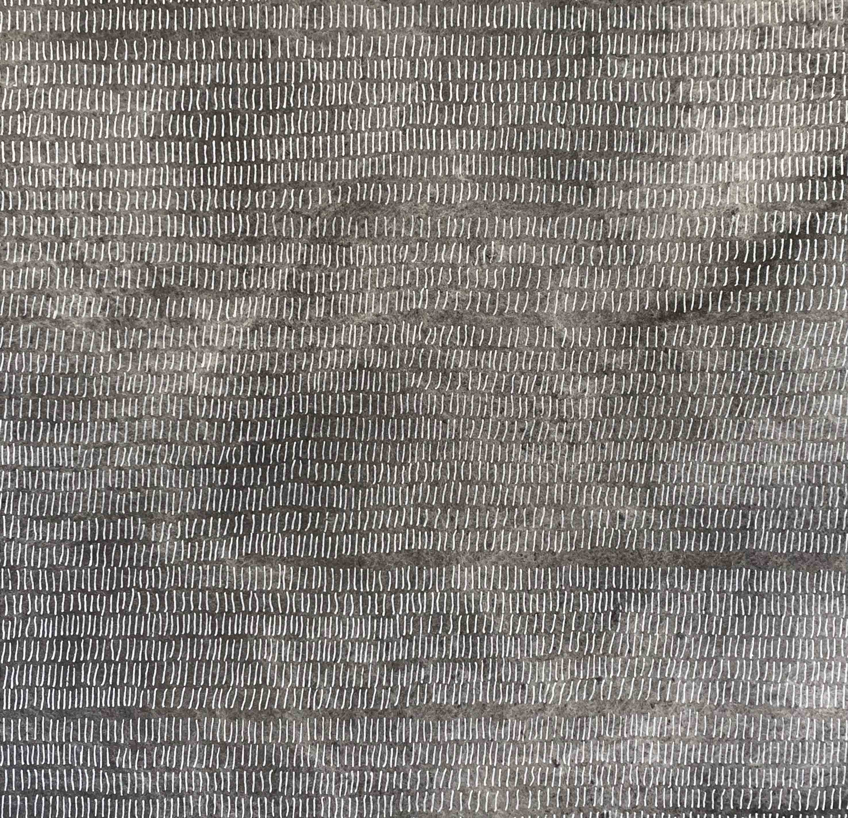 Being in Time will also feature two other pieces that Carrie describes as made with cross marks, made using a similar process but not in one sitting. In addition, some smaller works from a series called Fragility of Time. These are inspired by research showing how our attention spans have reduced since the advent of the smartphone. Carrie explains these drawings were created by piercing the paper with sharp tools, with each hole representing a second of time.