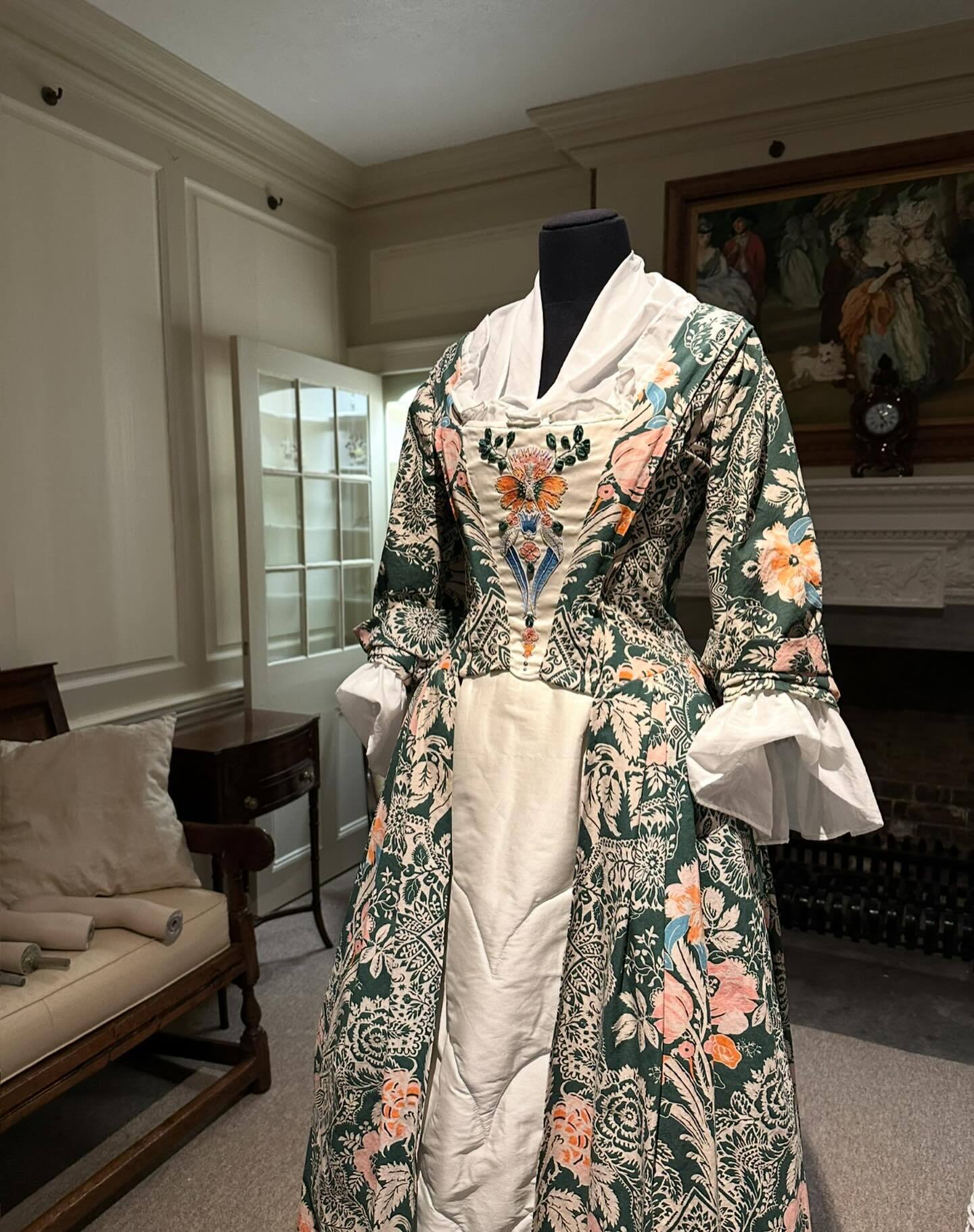 The 18th-century dress, a replica from the museum’s collection, was expertly made by Arts University Bournemouth (AUB) graduate, Jazmine Carroll, and beautifully embroidered by Fleur Webb, both from MA Historical Costume at AUB.