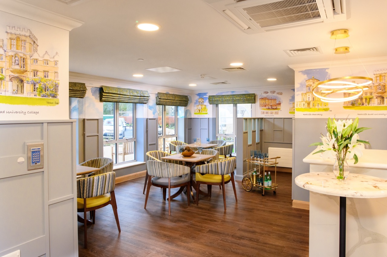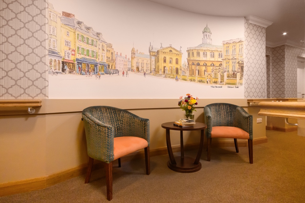 Diana’s concept was rooted in the local culture and history of Oxfordshire and developed through a collaboration with local artist Valerie Petts, whose architectural paintings were transformed into bespoke wall coverings and murals. By incorporating local themes, custom artwork, and dementia-enabling features, the project achieved a space where residents can feel safe, comfortable, and deeply connected to their surroundings.