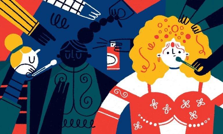 By this point, everybody’s getting ready for the show; putting on their make-up and coming to wardrobe to get their hair done. We have quite a few hairstyles in the show and some girls need their hair braiding underneath their hairnets for their wigs, which I also help with.