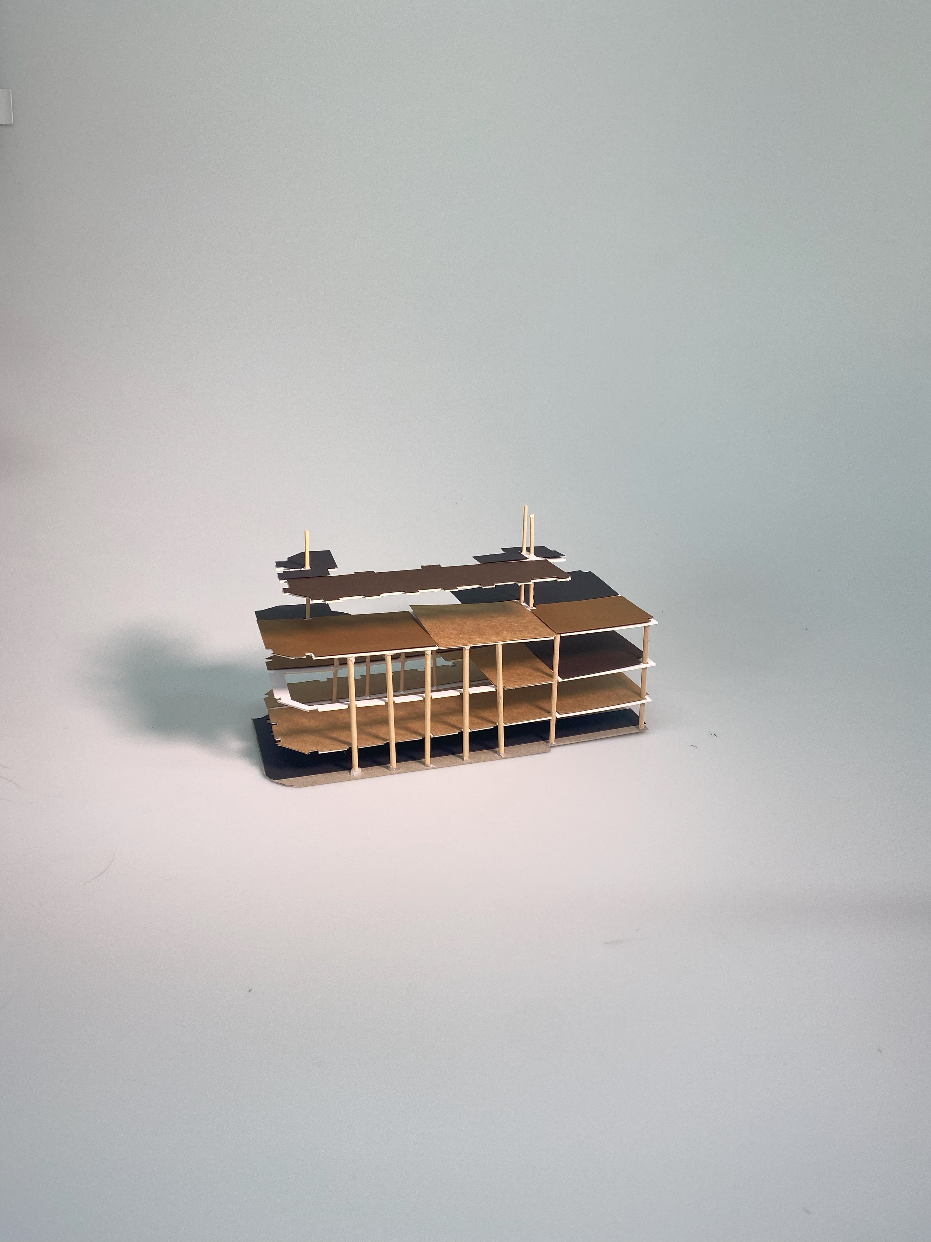 By experimenting with modelmaking and using different materials, this model allowed me to identify how I prefer to make models that have more than one use. We accomplished this by deciding to make it an interactive model. This was so that we could separate each floor of the building, as it was particularly large, to obtain sufficient visuals and perspectives. By having floors that could move, it could create the desired exploded views. Therefore, we were able to use this model as a resource to communicate our design thinking, including systems and zoning.