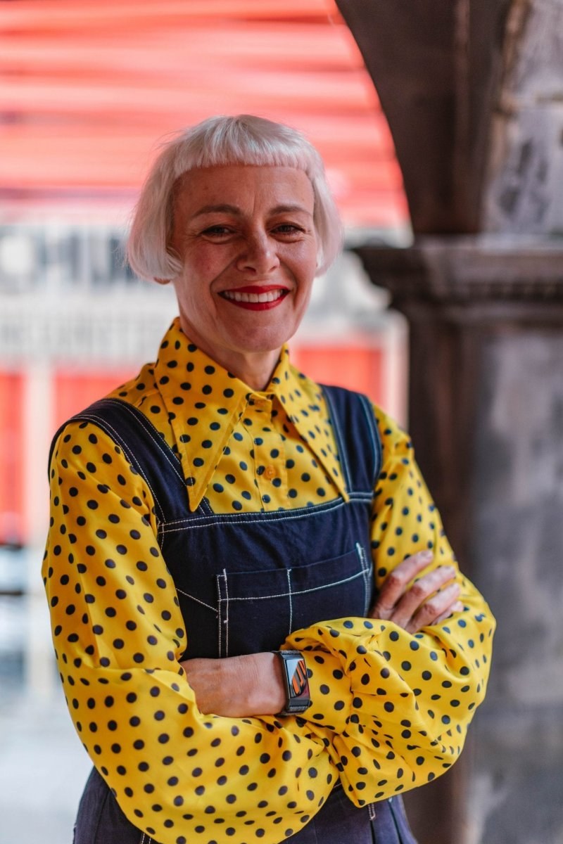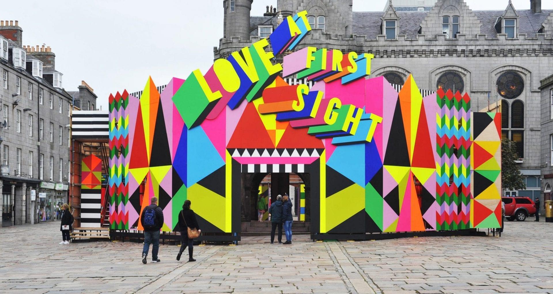 Morag Myerscough is well known for her large-scale structural installations which bring colour and life to public spaces across the country and internationally. Her work can be seen in Sheffield children’s hospital, Burntwood School, Design Museum, London and recent temporary installations from Aberdeen to Australia and New Zealand where the sense of place is understood and developed in collaboration with the local communities.