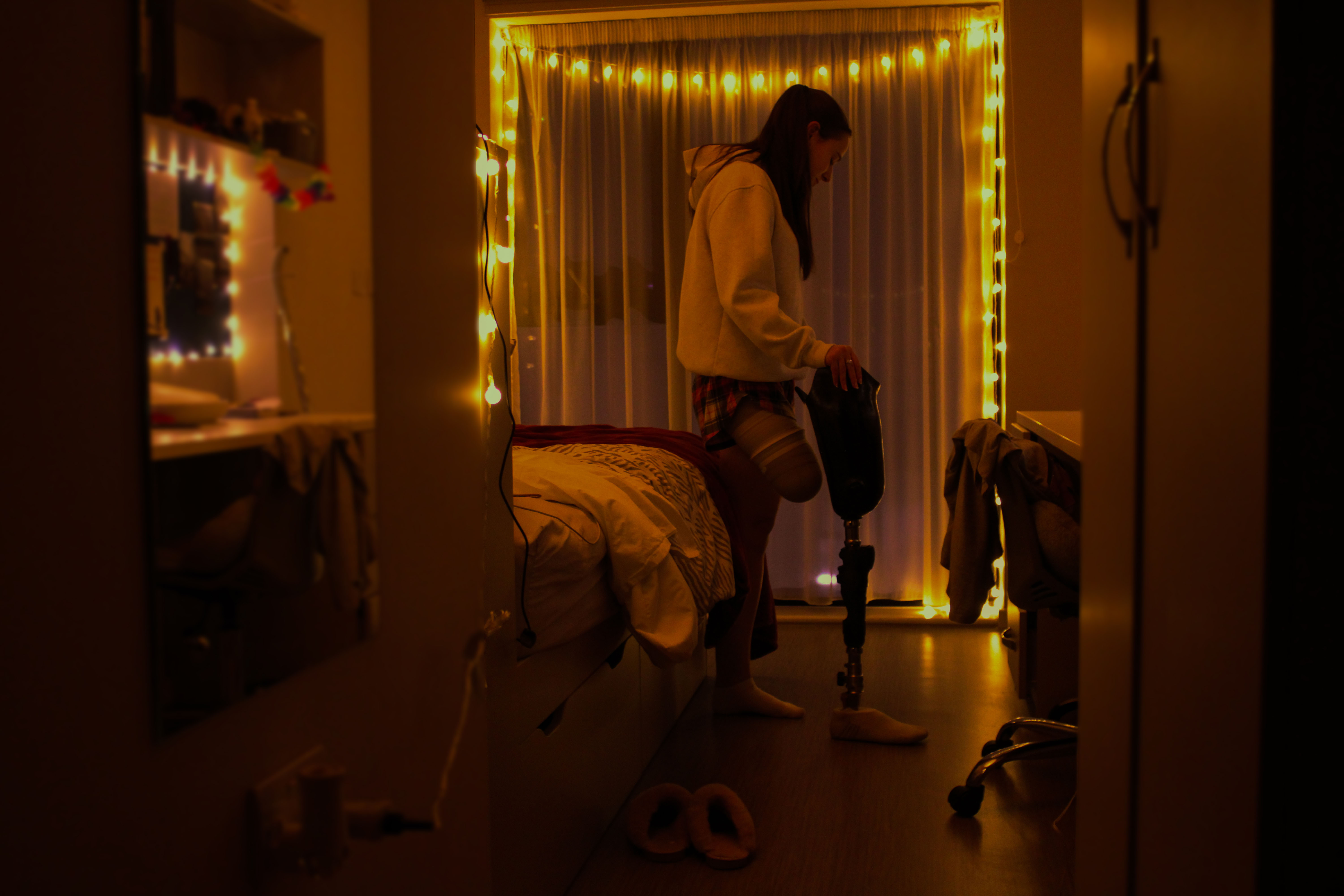 Amelia, my photo subject, offered herself to show a quiet and personal ‘unique everyday moment’ for her – taking off her prosthetic leg each evening. It was important to me for this image to convey not pity, but a sense of calm, vulnerability and appreciation.