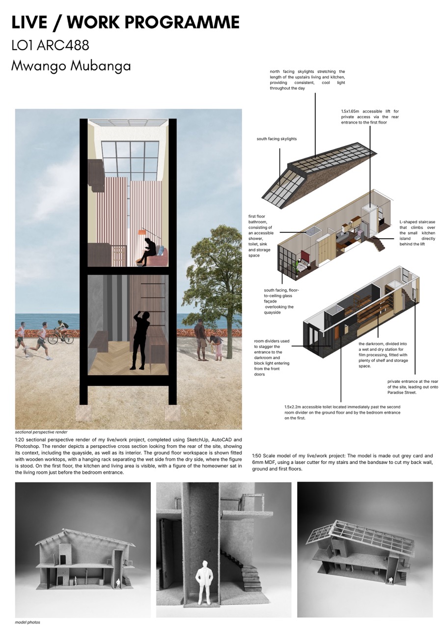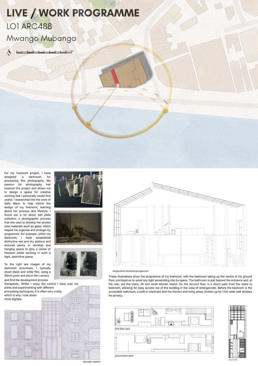At university, I have also been able to integrate photography into my architectural work. My most recent project involved designing a photographic darkroom for film processing, allowing me to explore the relationship between light, space and creative practice, building on what I know about photography through research and experimentation to reach my final design.