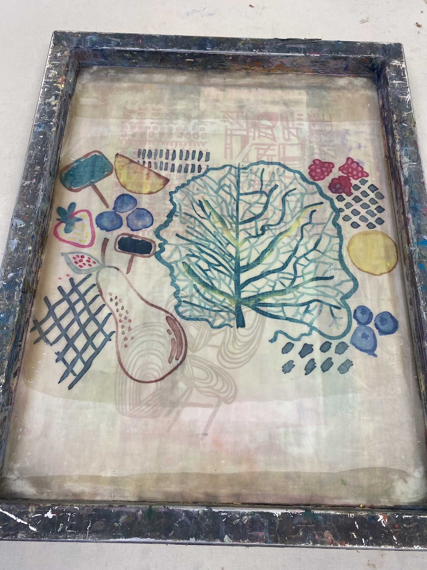 I liked this technique because you can achieve a design with lots of colour in one go, whereas with normal screen printing you would have to separate the design into different coloured screens and wait for each layer to dry, which is more time-consuming. I also liked how you can paint a design onto exposed screens, like stripes or polka dots, to capture it through other shapes. The colours are very vibrant and vivid, which was also nice.