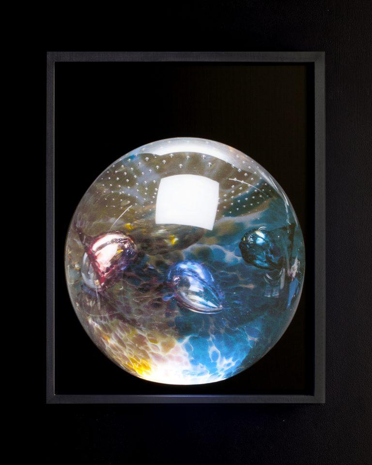 Paul’s lenticulars posit a halfway point between object and depiction, exploiting the transparent nature of the glass to suggest a perceptual slippage into the interior of these spheres.