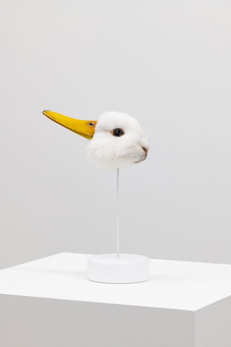 Simon Cunningham’s ‘Duckrabbit’ poses the same perceptual problem as the famous two-dimensional illustration, with the additional complication of tactility and form. The ambiguous image known as the Rabbit – Duck illusion is given substance by Cunningham as a taxidermised sculpture. It’s hard not to reach for this impossible object, turn it over in your hands, to better understand it through touch. Simultaneously one and other, the work is an inscription of difference within the same.
