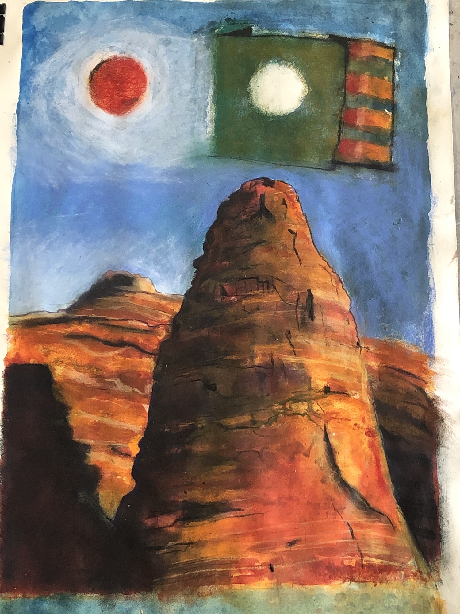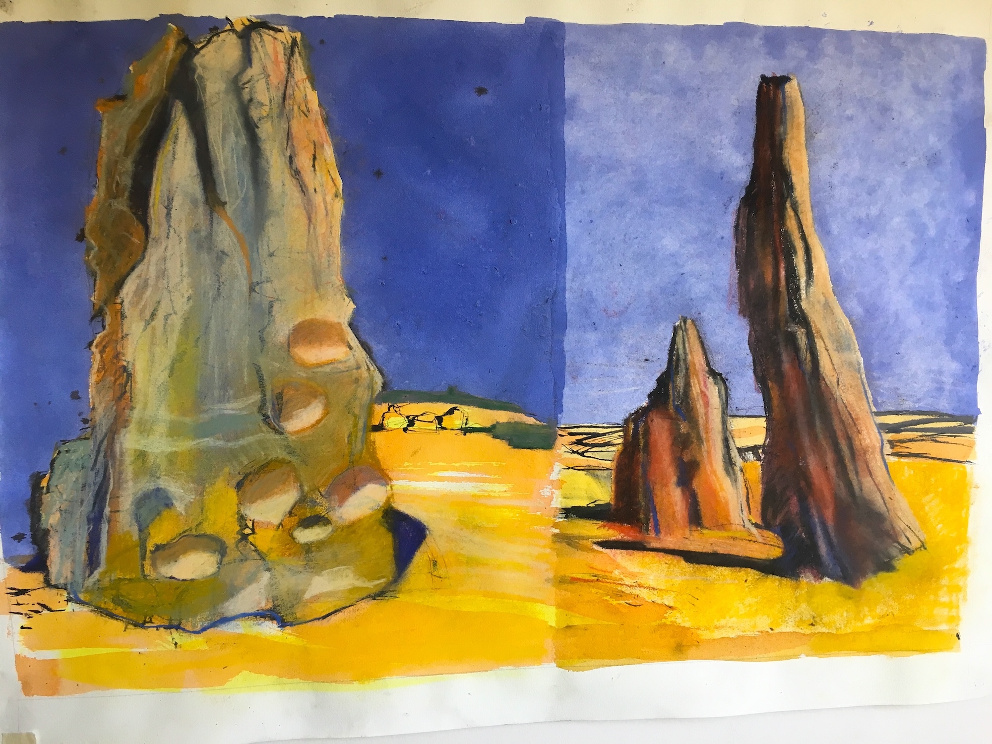 The paintings and drawings in this modest catalogue represent a portion of our experiences as a family. Often it was physically impossible to paint and draw, not just because of the practical discomforts, the searing heat and the piercing light, but more often it was the sheer spectacle of saturated colour, of infinite spaces and sounds of the gusting wind that would stop us, quite literally, in our tracks, or more often the invisible tracks of unseen feet that had trodden this way for tens of thousands of years”.