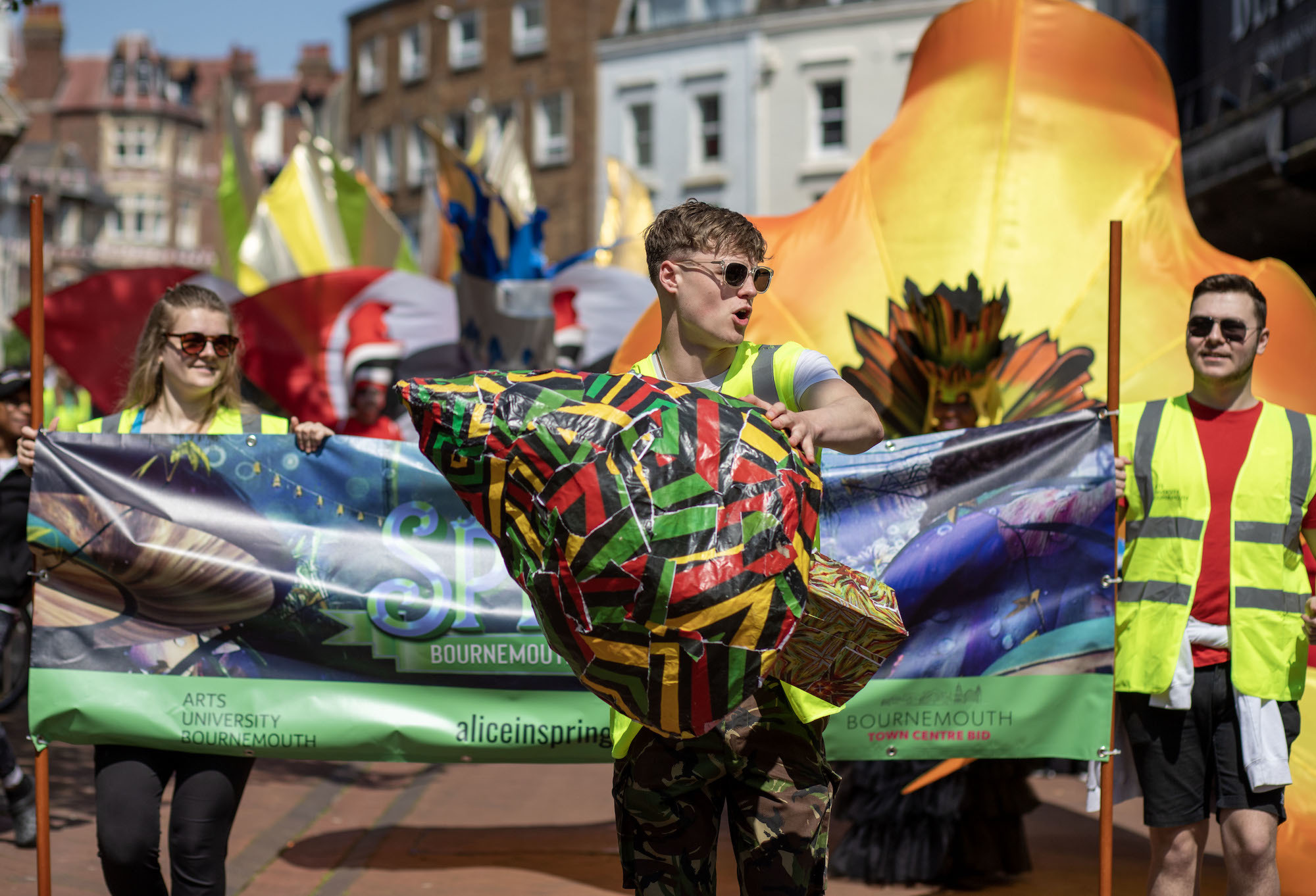 This collaboration resulted in Events Management students bringing Carnival to the streets of Bournemouth in 2023 and 2024 as part of Alice in Spring, an annual, family-friendly festival designed, developed and delivered by the students in Bournemouth town centre as part of their coursework and study. In the 2024 Carnival, students from BA (Hons) Makeup, Hair and Prosthetics and BA (Hons) Modelmaking took part in the procession alongside Mahogany, wearing Mahogany’s costumes.