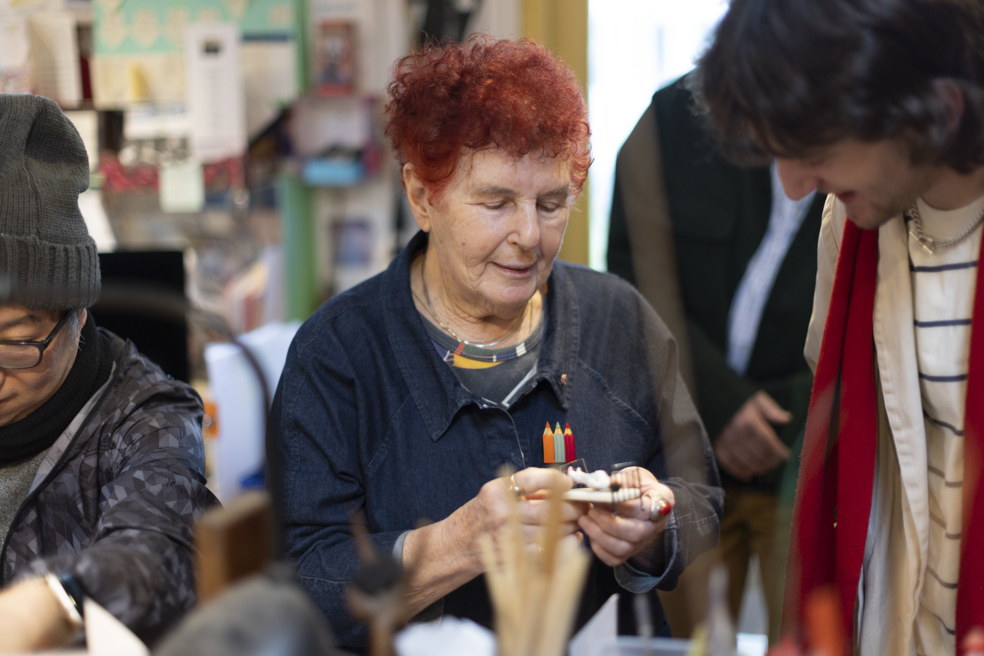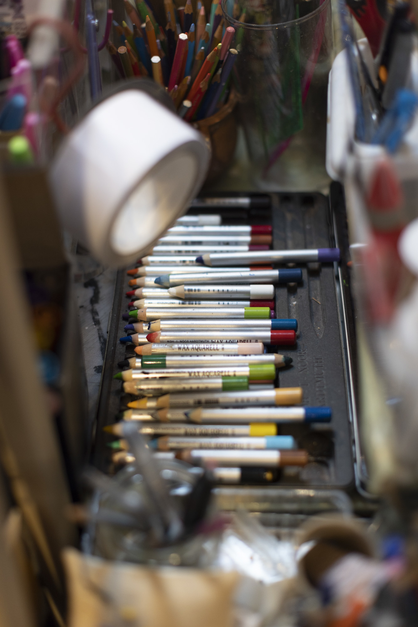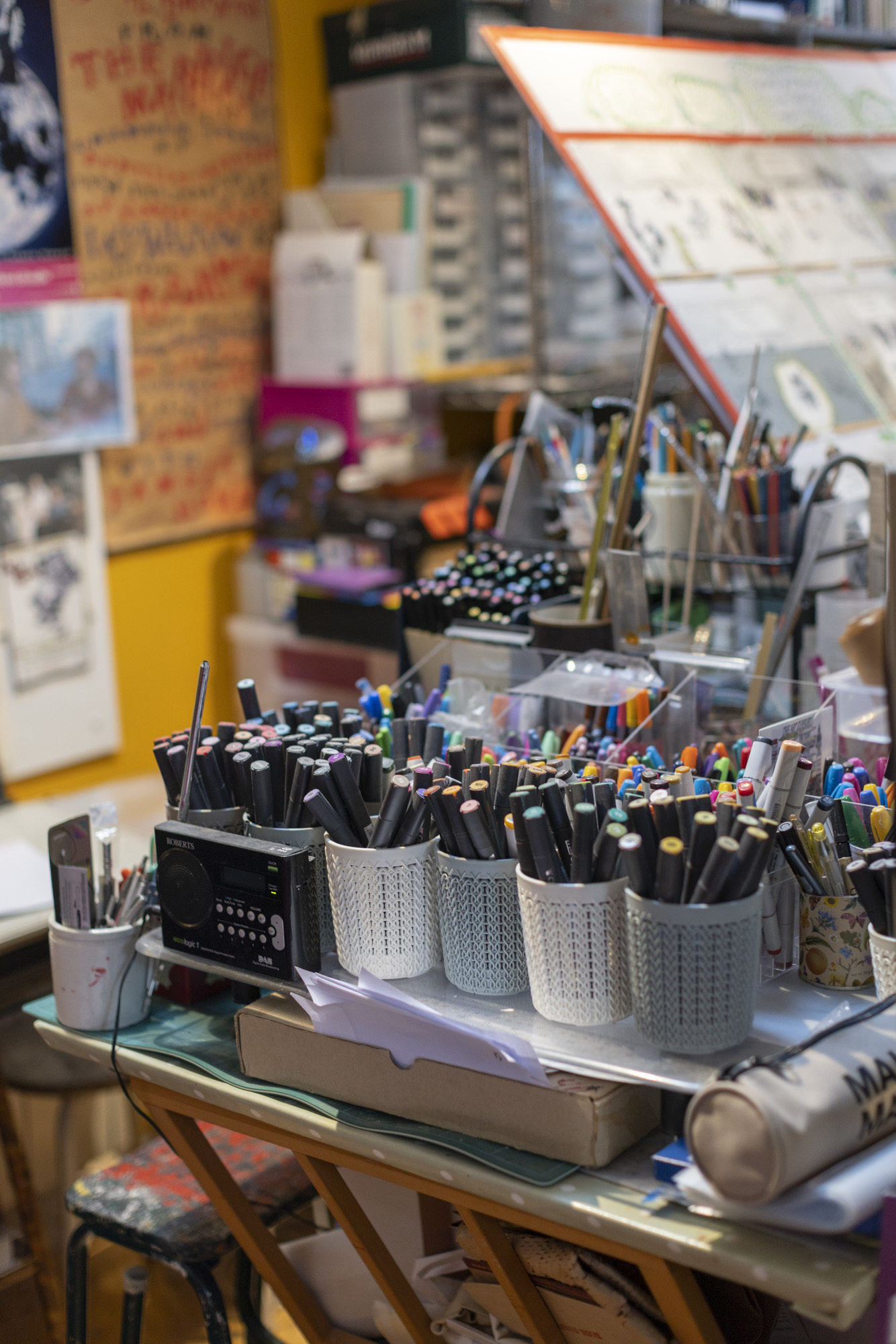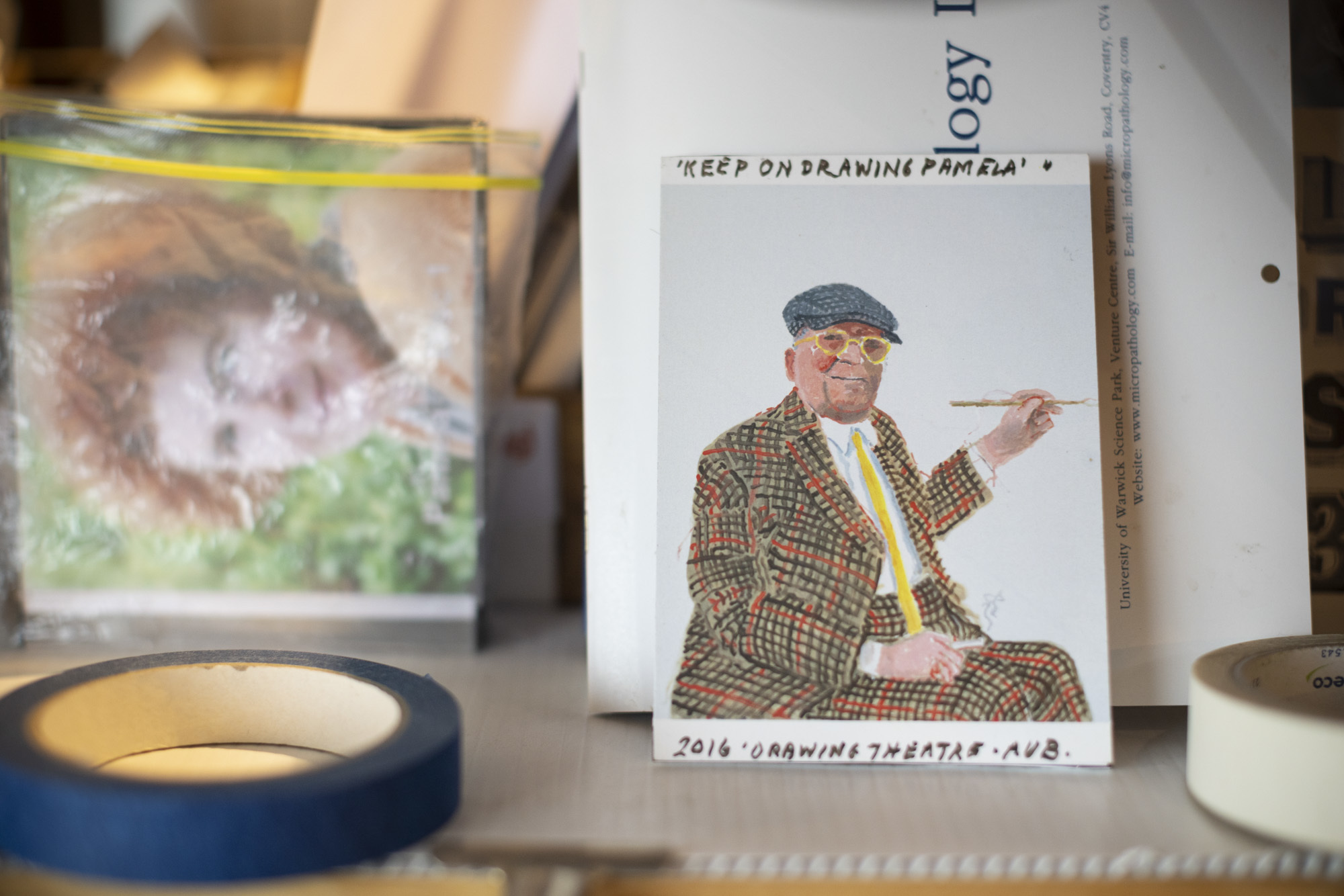 Posters for shows in London, Brno, Ljubljana, Glasgow, Prague, Toronto, Los Angeles, Thessaloniki, and Belgrade cover the walls. Every square inch of space has drawings, pots of pencils and pens, itemised files, shoeboxes full of drawings. I spy a postcard given to Pamela by David Hockney – inscribed “Keep drawing, Pamela” – along with a Palomino Black Wing pencil now worn down to a stub. Drawing is self-evidently at the heart of her practice and is the defining activity of this studio space. Joyful creativity is balanced by a fierce sense of industry and order.