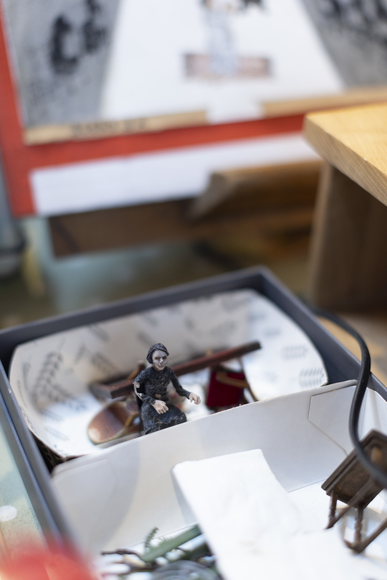 A huge storyboard of a current project dominates one side of the space – a production celebrating the life and times of Irish playwright and poet, Brendan Behan. Allan shows us a model of Behan in a hospital bed, stomach extended – “that’s the booze, you know” says Pamela.